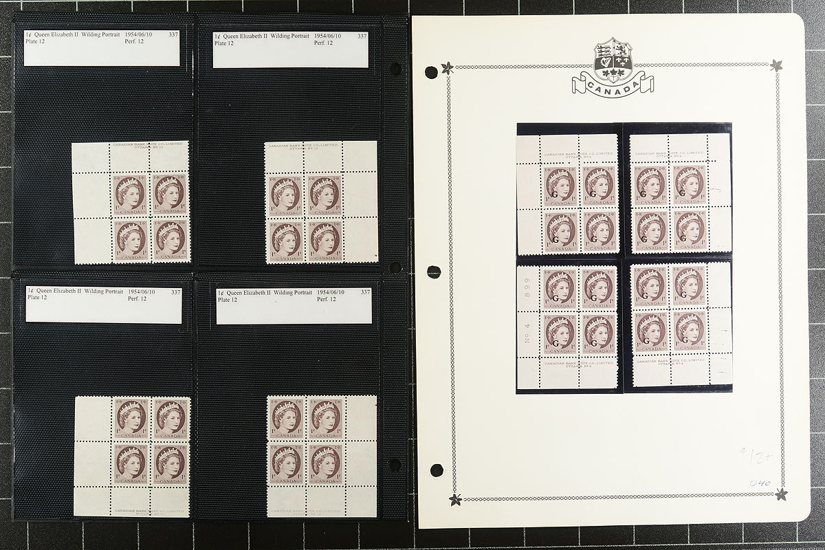 Collection of primarily never hinged QEII Wilding plate blocks, containing 99 plate blocks, almost all in matched sets, neatly organized by denomination in hingeless album pages or stock pages. The collection begins with 1c matched set of plate blocks ranging from plates #s 1-7, 8n, 9, 11-12, and continues with "G" overprint official matched set plate blocks for all Wilding denominations with various plate numbers. Owner's 2007 Unitrade value for the collection totals $413.00 (counted as fine with no NH premiums). A nice clean group and something to add to your Canada collection. Estimate =