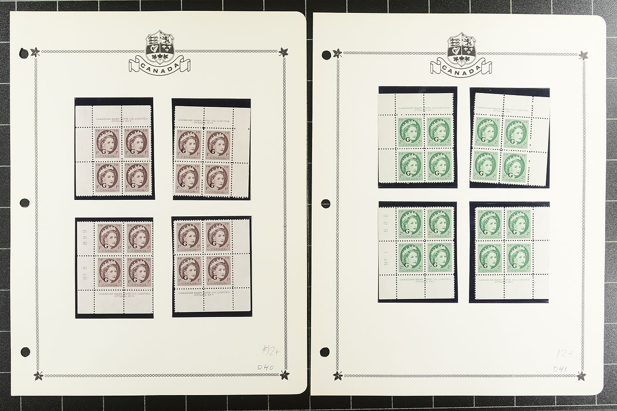 Collection of primarily never hinged QEII Wilding plate blocks, containing 99 plate blocks, almost all in matched sets, neatly organized by denomination in hingeless album pages or stock pages. The collection begins with 1c matched set of plate blocks ranging from plates #s 1-7, 8n, 9, 11-12, and continues with "G" overprint official matched set plate blocks for all Wilding denominations with various plate numbers. Owner's 2007 Unitrade value for the collection totals $413.00 (counted as fine with no NH premiums). A nice clean group and something to add to your Canada collection. Estimate =