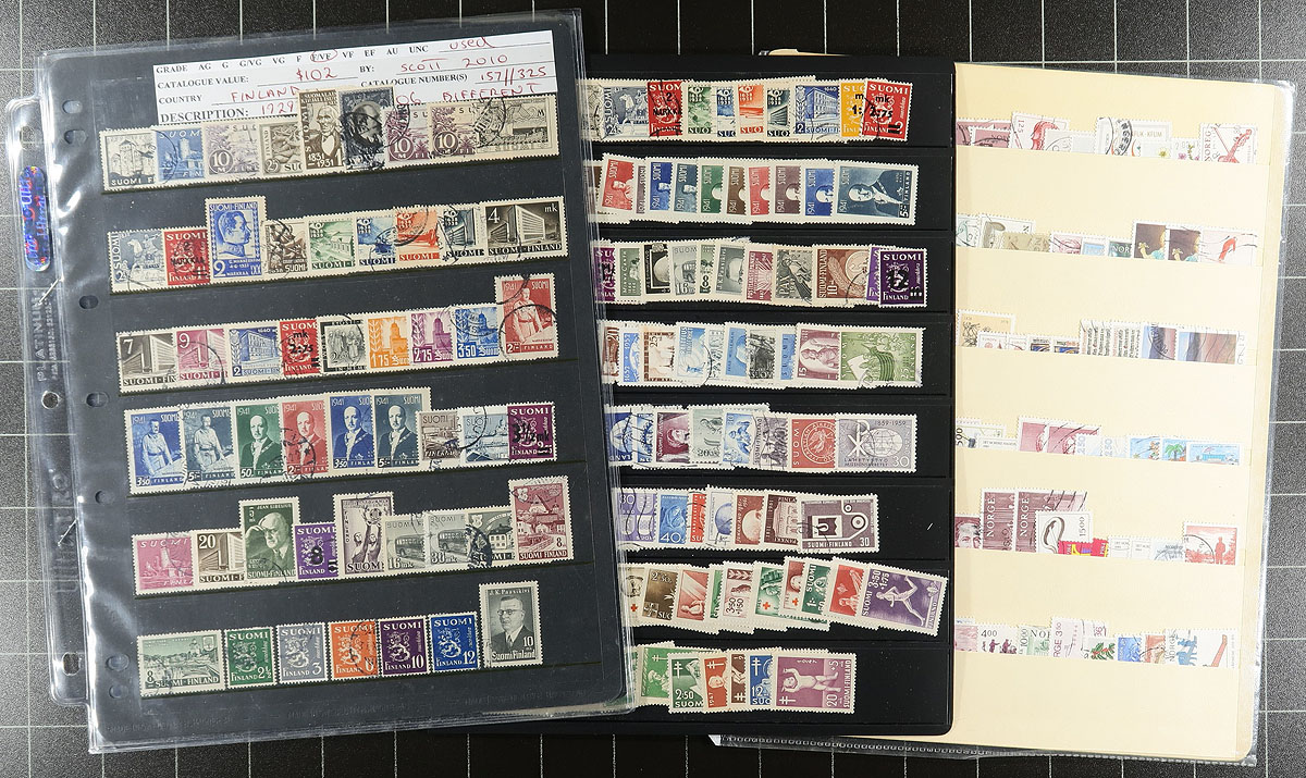 Scandinavia. Accumulation of used Scandinavia, 1870's-2011, containing a few thousand stamps, including a few souvenir sheets, in over 30 stock or album pages. An overview of the lot indicated good representation from Finland, Sweden, and Norway, along with some Iceland, Denmark and Faroe Islands, not singles, sets, and partial sets cataloguing $10 and up, noting Finland #75 (c.v. $45), leaving better finds to the dedicated collectors. Owner's 2012 Scott catalogue value for the lot totals US$1,728.00 ($2332.80 CDN). A nice lot from these popular collecting countries, overall fine to very fine. Estimate =