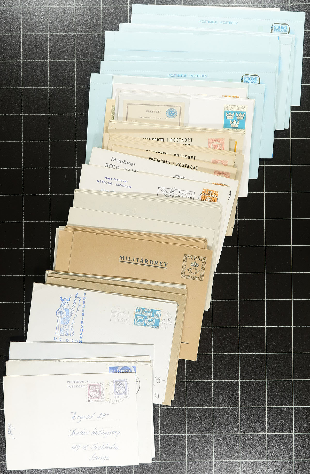 Scandinavia. Accumulation of Scandinavia covers and cards loose in a box, 1960's-1980's, containing many hundreds of items, with representation from Sweden, and a smaller selection of Finland, noting first day covers, postal stationery (primarily unused), maximum cards, and presentation booklets. A nice variety of material noting singles and sets frankings, noting many topical and thematic subjects. Clean and very fine. Estimate =