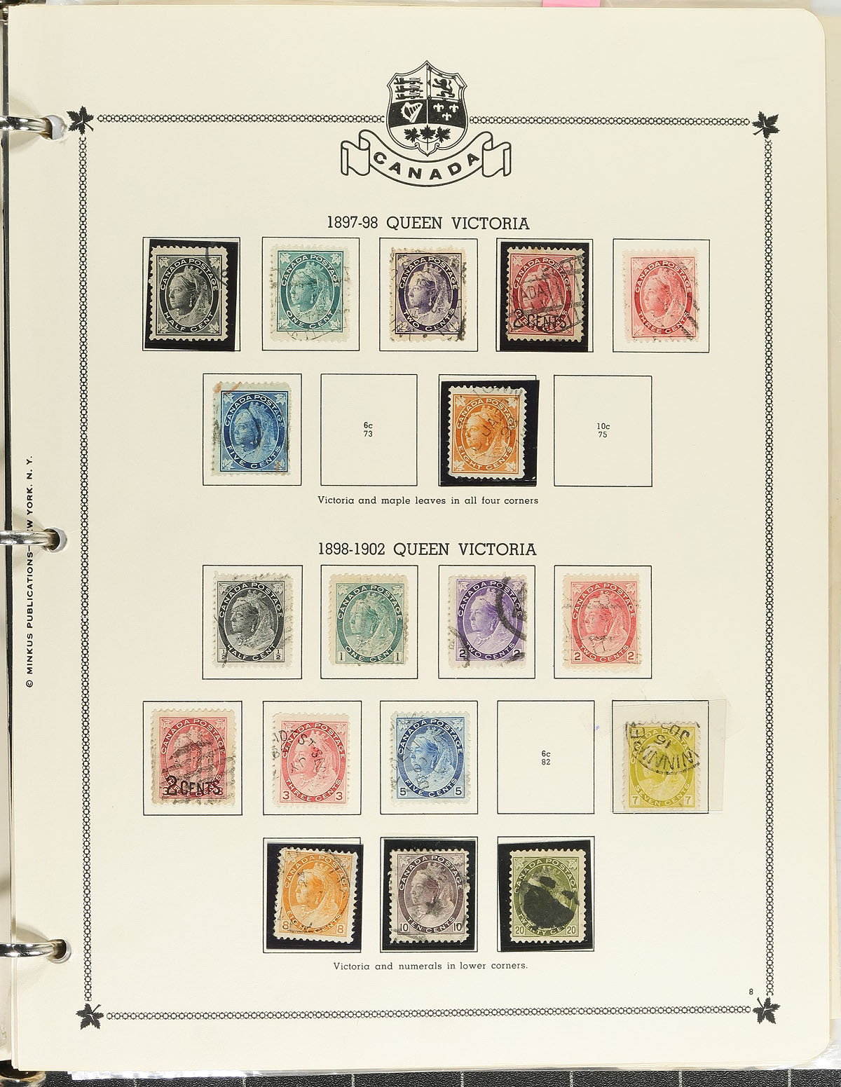 Nice collection of primarily used Canada, 1850's-1985, containing roughly 1,500 stamps neatly organized in two Minkus albums. The collection generally ranges from Scott #14/1074, really beginning with 20 Small Queens (10c x3, 20c and 50c Widow Weeds), partial sets of Leaf and Numerals, with complete sets of Edwards, Quebecs, Admirals, Scrolls, right up to the Peace issues. The collection also includes back of the book issues, coils, booklet panes, souvenir sheets, precancels, printing varieties, a few covers (noting B.C. postmarks), and more. Postmark interesting includes CDS and other types, including many "socked on the nose" town cancels. We note a few faults with some of the early stamps, still a nice collection with a few better cataloguing stamps, overall fine to very fine. Estimate =