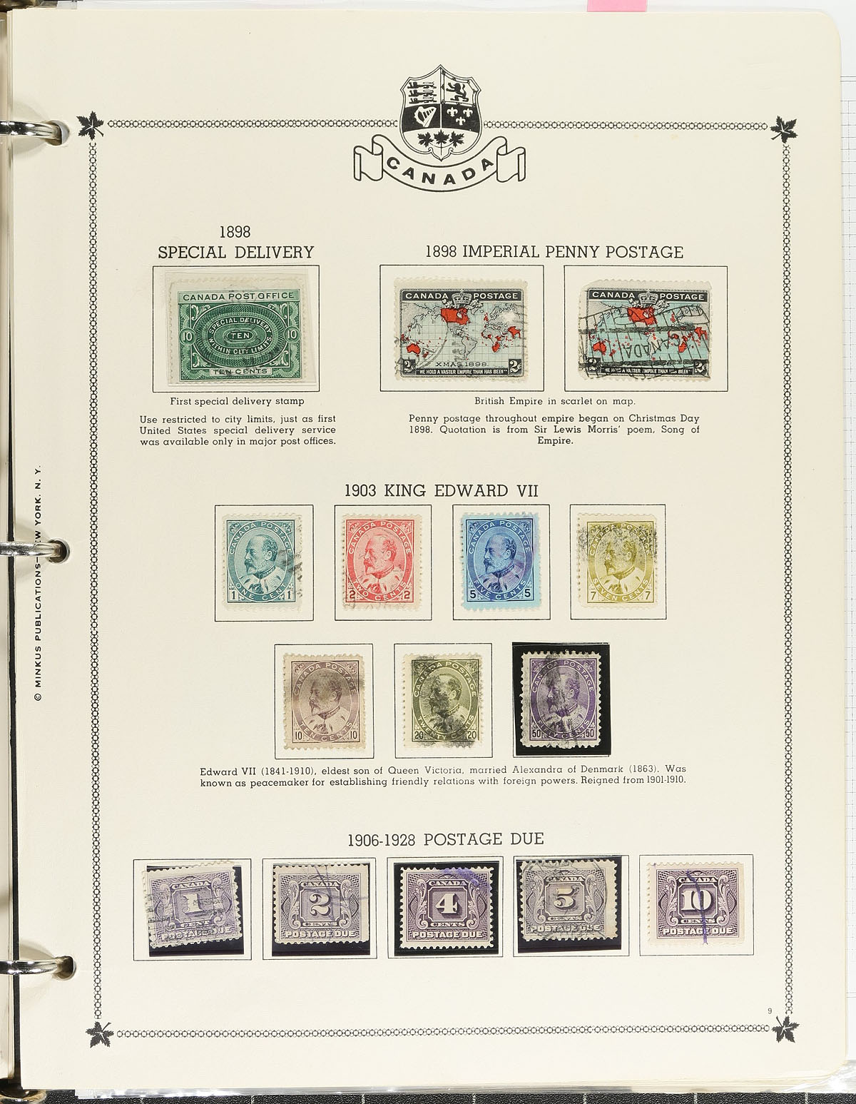Nice collection of primarily used Canada, 1850's-1985, containing roughly 1,500 stamps neatly organized in two Minkus albums. The collection generally ranges from Scott #14/1074, really beginning with 20 Small Queens (10c x3, 20c and 50c Widow Weeds), partial sets of Leaf and Numerals, with complete sets of Edwards, Quebecs, Admirals, Scrolls, right up to the Peace issues. The collection also includes back of the book issues, coils, booklet panes, souvenir sheets, precancels, printing varieties, a few covers (noting B.C. postmarks), and more. Postmark interesting includes CDS and other types, including many "socked on the nose" town cancels. We note a few faults with some of the early stamps, still a nice collection with a few better cataloguing stamps, overall fine to very fine. Estimate =