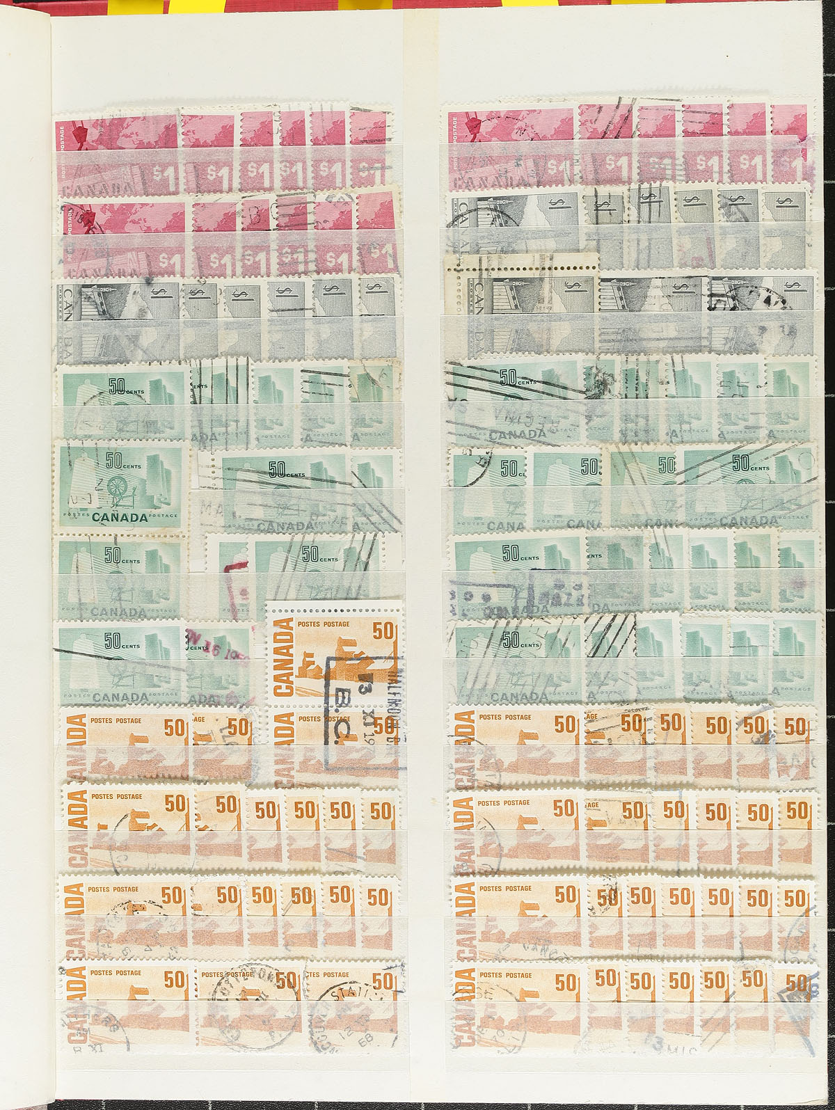 Large accumulation of used Canada, 1950's-2005, containing roughly 20,000 stamps in a variety of formats including a thick stockbook, several manila or Vario-style pages in 3 binders, loose pages, and a few hundred glassines. Despite the large size, this is a very well organized lot using Scott numbers, noting many high denominations, a few souvenir sheets, and more. A spot check indicated a wide variety of postmarks including CDS, MOON, POCON, and probably other types, including several "socked on the nose" town cancels. A great lot for the postmark hunter, and a potentially high cataloguing lot, overall fine to very fine. Estimate =