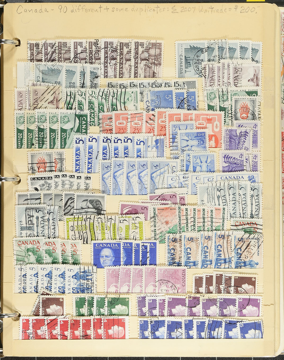 Large accumulation of used Canada, 1950's-2005, containing roughly 20,000 stamps in a variety of formats including a thick stockbook, several manila or Vario-style pages in 3 binders, loose pages, and a few hundred glassines. Despite the large size, this is a very well organized lot using Scott numbers, noting many high denominations, a few souvenir sheets, and more. A spot check indicated a wide variety of postmarks including CDS, MOON, POCON, and probably other types, including several "socked on the nose" town cancels. A great lot for the postmark hunter, and a potentially high cataloguing lot, overall fine to very fine. Estimate =