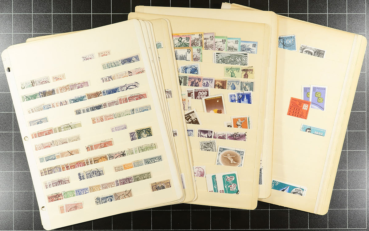 Large accumulation of used Poland, 1918-1990's, containing many thousands of stamps in a few hundred album or manila stock pages. A quick cursory check indicated singles and sets noting a high degree of completion in period, along with a few mint stamps scattered within. The manila pages appear to be the owner's duplicates and unchecked for better postmarks, with duplication ranges from 3 to 5 for most issues. A nice lot for the worldwide collector as this will fill several empty spots in most albums, or a good start to a highly interesting area of philately, overall fine to very fine. Estimate =