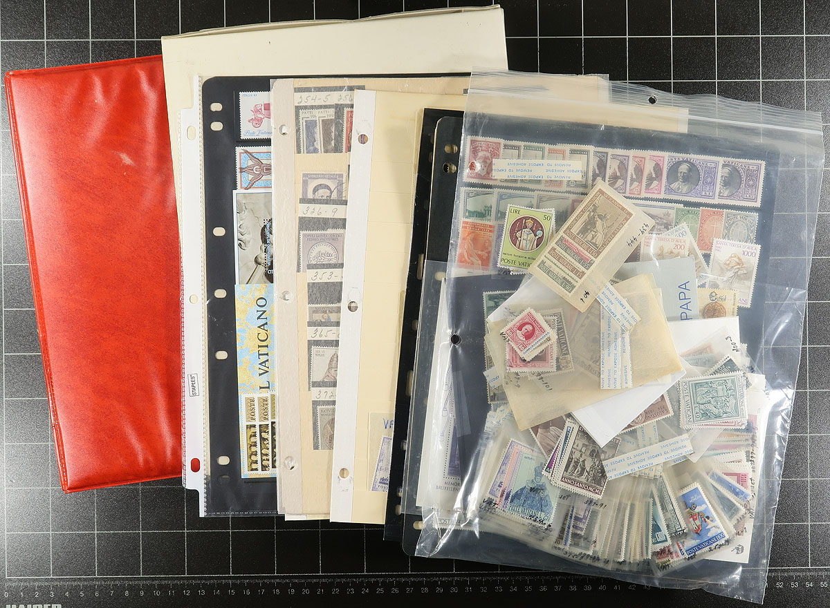 Nice collection of mint Vatican City, 1939-1996, containing roughly 700 stamps in a stockbook, a few stock pages, and several glassines. The collection generally ranges from Scott #68/973, including several sets, a few souvenir sheets, and some back of the book material. A spot check indicated a few stamps and sets cataloguing $5 to $15 and up each. Owner's older catalogue value for the lot totals US$406.00 ($548.10 CDN). A nice lot for the thematic or topical collector, with a spot check indicating a mix of hinged and never hinged material, overall fine to very fine. Estimate =