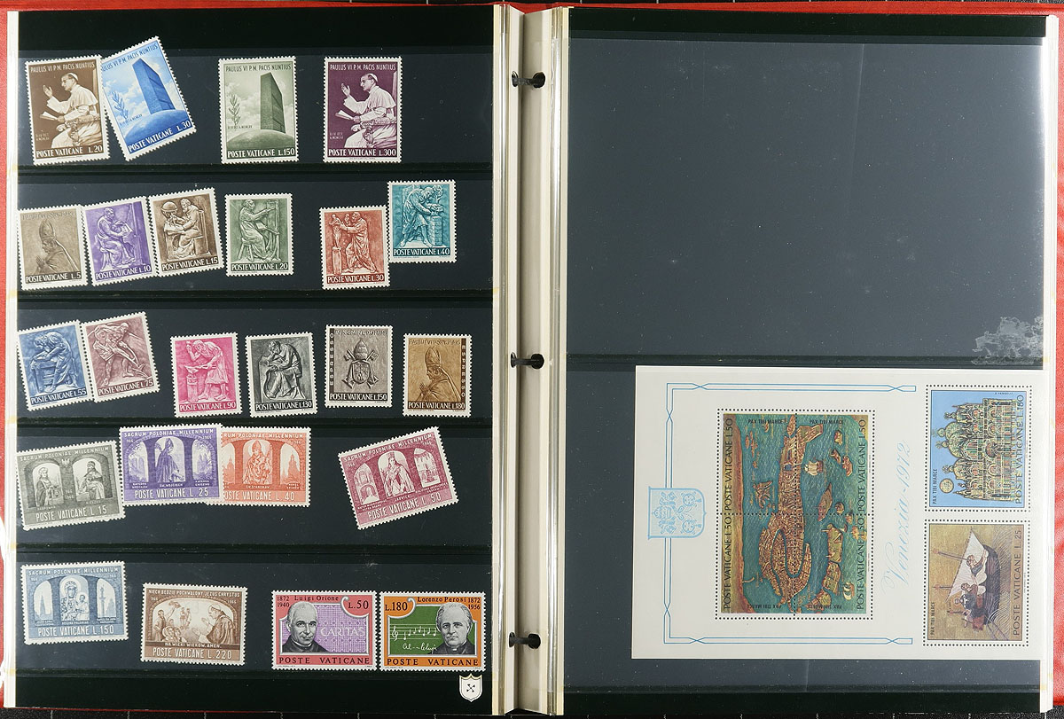 Nice collection of mint Vatican City, 1939-1996, containing roughly 700 stamps in a stockbook, a few stock pages, and several glassines. The collection generally ranges from Scott #68/973, including several sets, a few souvenir sheets, and some back of the book material. A spot check indicated a few stamps and sets cataloguing $5 to $15 and up each. Owner's older catalogue value for the lot totals US$406.00 ($548.10 CDN). A nice lot for the thematic or topical collector, with a spot check indicating a mix of hinged and never hinged material, overall fine to very fine. Estimate =