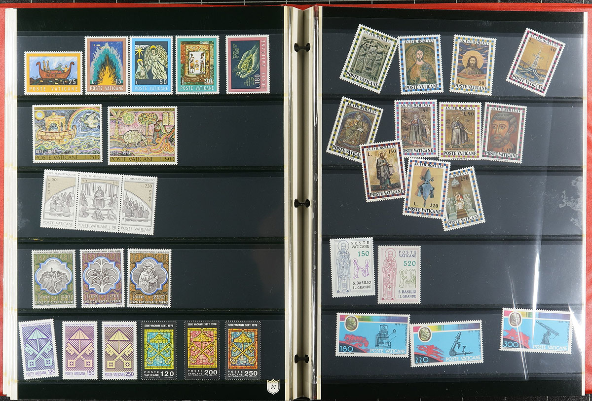 Nice collection of mint Vatican City, 1939-1996, containing roughly 700 stamps in a stockbook, a few stock pages, and several glassines. The collection generally ranges from Scott #68/973, including several sets, a few souvenir sheets, and some back of the book material. A spot check indicated a few stamps and sets cataloguing $5 to $15 and up each. Owner's older catalogue value for the lot totals US$406.00 ($548.10 CDN). A nice lot for the thematic or topical collector, with a spot check indicating a mix of hinged and never hinged material, overall fine to very fine. Estimate =