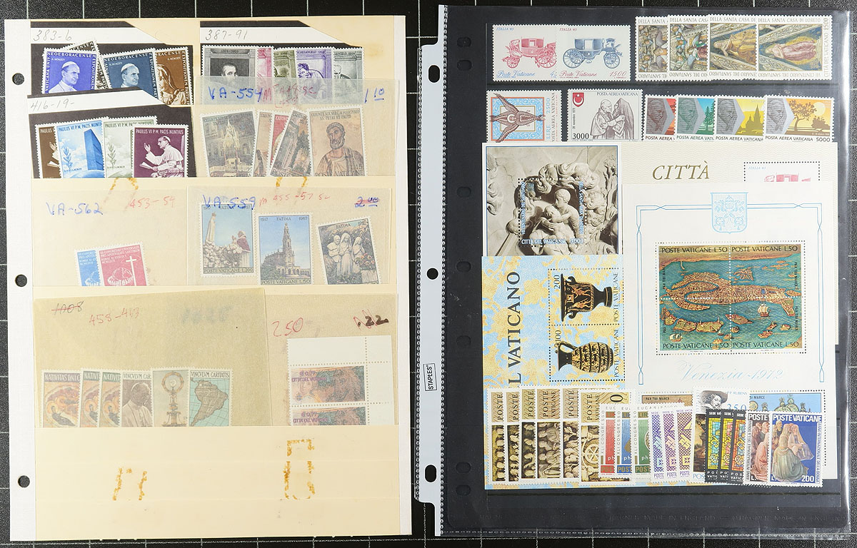 Nice collection of mint Vatican City, 1939-1996, containing roughly 700 stamps in a stockbook, a few stock pages, and several glassines. The collection generally ranges from Scott #68/973, including several sets, a few souvenir sheets, and some back of the book material. A spot check indicated a few stamps and sets cataloguing $5 to $15 and up each. Owner's older catalogue value for the lot totals US$406.00 ($548.10 CDN). A nice lot for the thematic or topical collector, with a spot check indicating a mix of hinged and never hinged material, overall fine to very fine. Estimate =
