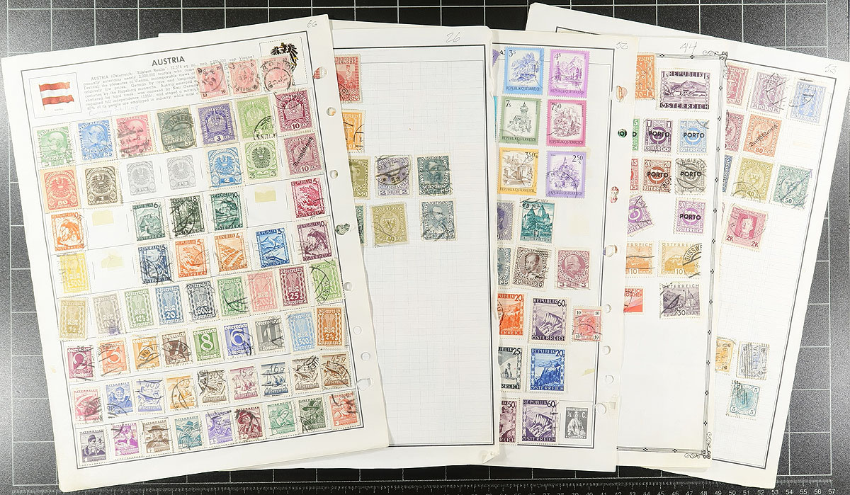 Accumulation of used Austria, 1860's-1992, containing over 1,000 stamps in several stock or album pages, a few small stockbooks, 102 cards, and more. The lot generally ranges from Scott #3/1869, including some back of the book material, noting singles and partial sets, with a few cataloguing $10 and up. Owner's 2014 Scott catalogue value for the lot totals US$974.00 ($1314.90 CDN). Postmark interest includes CDS types, including many "socked on the nose" town cancels. A few small faults to be expected, overall fine to very fine. Estimate =