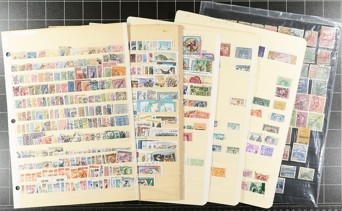 Accumulation of used Austria, 1860's-1992, containing over 1,000 stamps in several stock or album pages, a few small stockbooks, 102 cards, and more. The lot generally ranges from Scott #3/1869, including some back of the book material, noting singles and partial sets, with a few cataloguing $10 and up. Owner's 2014 Scott catalogue value for the lot totals US$974.00 ($1314.90 CDN). Postmark interest includes CDS types, including many "socked on the nose" town cancels. A few small faults to be expected, overall fine to very fine. Estimate =