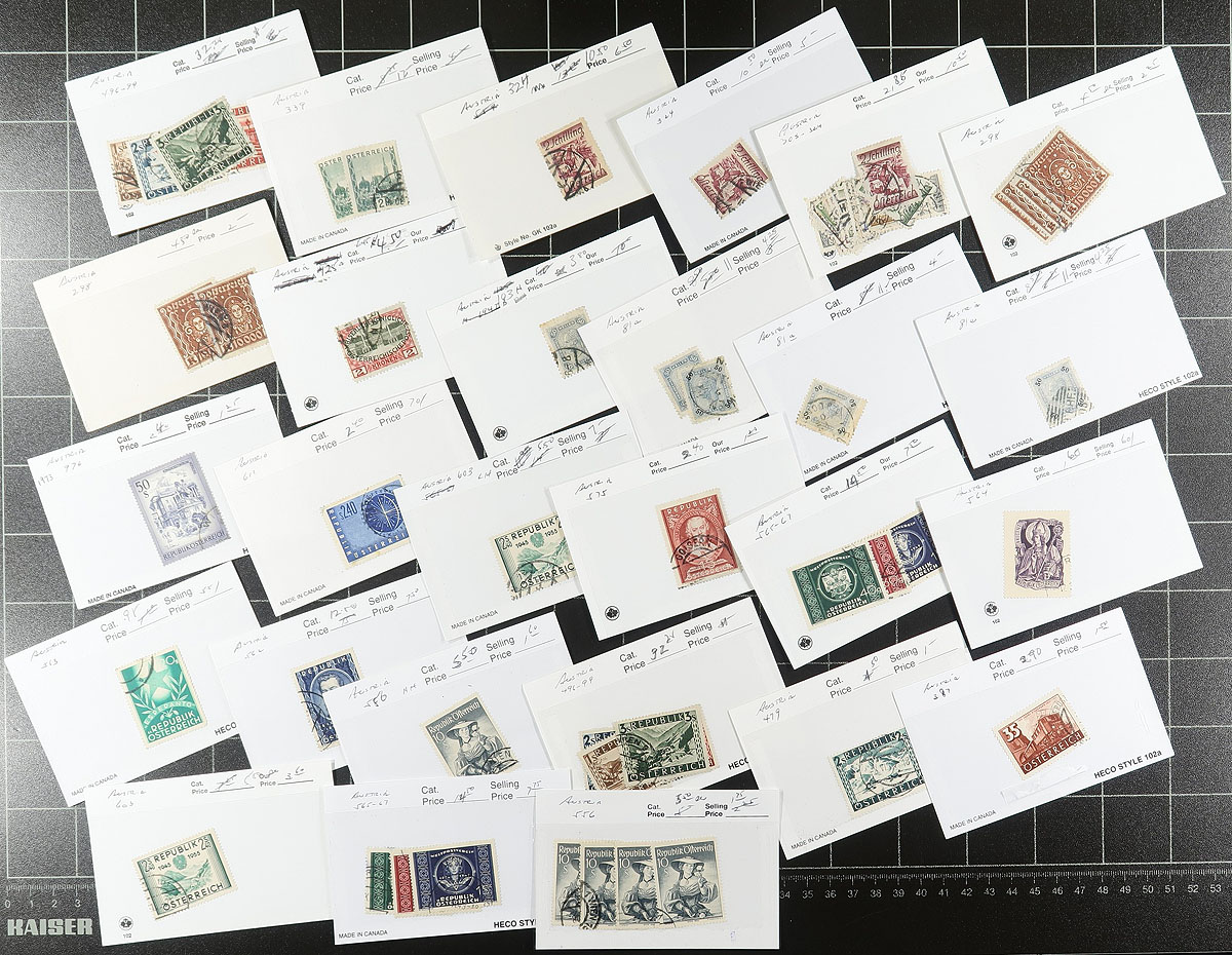 Accumulation of used Austria, 1860's-1992, containing over 1,000 stamps in several stock or album pages, a few small stockbooks, 102 cards, and more. The lot generally ranges from Scott #3/1869, including some back of the book material, noting singles and partial sets, with a few cataloguing $10 and up. Owner's 2014 Scott catalogue value for the lot totals US$974.00 ($1314.90 CDN). Postmark interest includes CDS types, including many "socked on the nose" town cancels. A few small faults to be expected, overall fine to very fine. Estimate =