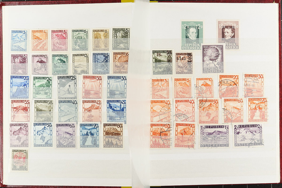Accumulation of used Austria, 1860's-1992, containing over 1,000 stamps in several stock or album pages, a few small stockbooks, 102 cards, and more. The lot generally ranges from Scott #3/1869, including some back of the book material, noting singles and partial sets, with a few cataloguing $10 and up. Owner's 2014 Scott catalogue value for the lot totals US$974.00 ($1314.90 CDN). Postmark interest includes CDS types, including many "socked on the nose" town cancels. A few small faults to be expected, overall fine to very fine. Estimate =