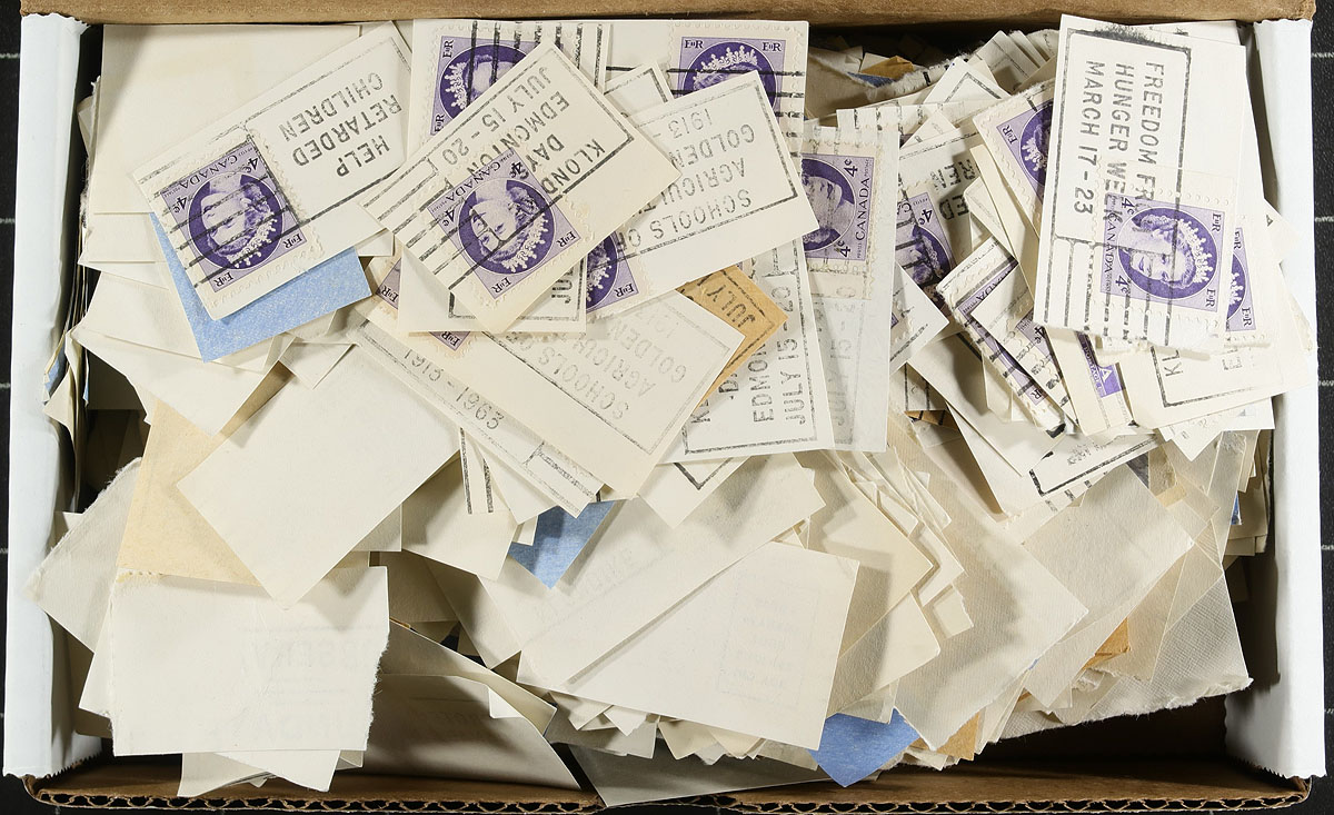 Accumulation of several thousands of Canada used, in a variety of formats, including stock pages, baggies, and more. A very quick check indicated primarily stamps ranging from the 1900's to modern, with several hundreds from the 1930's to the 1950's (in one large bag appearing to be dedicated to these issues). Completely unchecked for varieties and better postmarks, although we did spot cds, split ring, POCON, including many "socked on the nose" town cancels. A nice lot for the postmark hunter, overall fine to very fine. Estimate =
