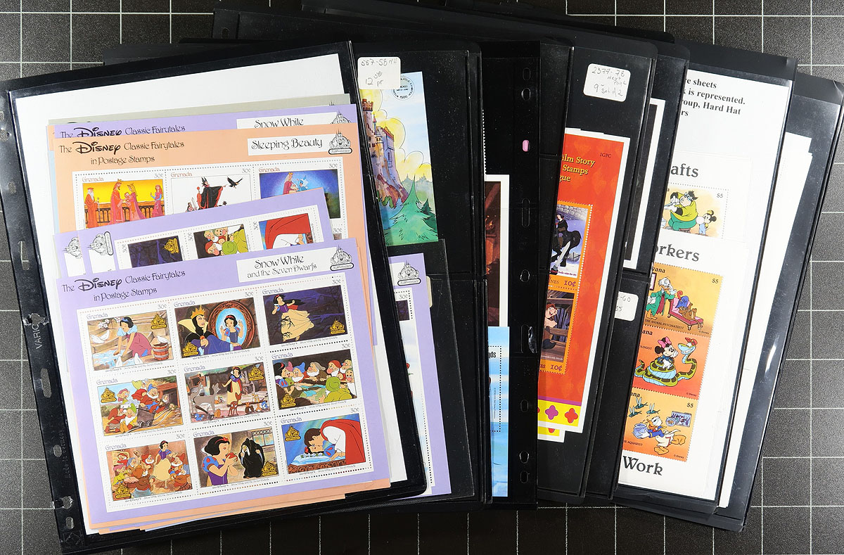 Lovely never hinged topical collection / accumulation of Disney sets and souvenir sheets in several stock pages, generally from the 1980's to the 1990's, primarily from Grenada and Grenada Grenadines, along with a few other countries. The lot includes roughly 185 souvenir sheets, and a few sets with owner's older Scott catalogue value for the lot totalling over $1,500. Duplication can range from 1 to 9 for some sheets, making this a nice lot for the topical or thematic collector, and dealers looking for stock, overall very fine. Estimate =