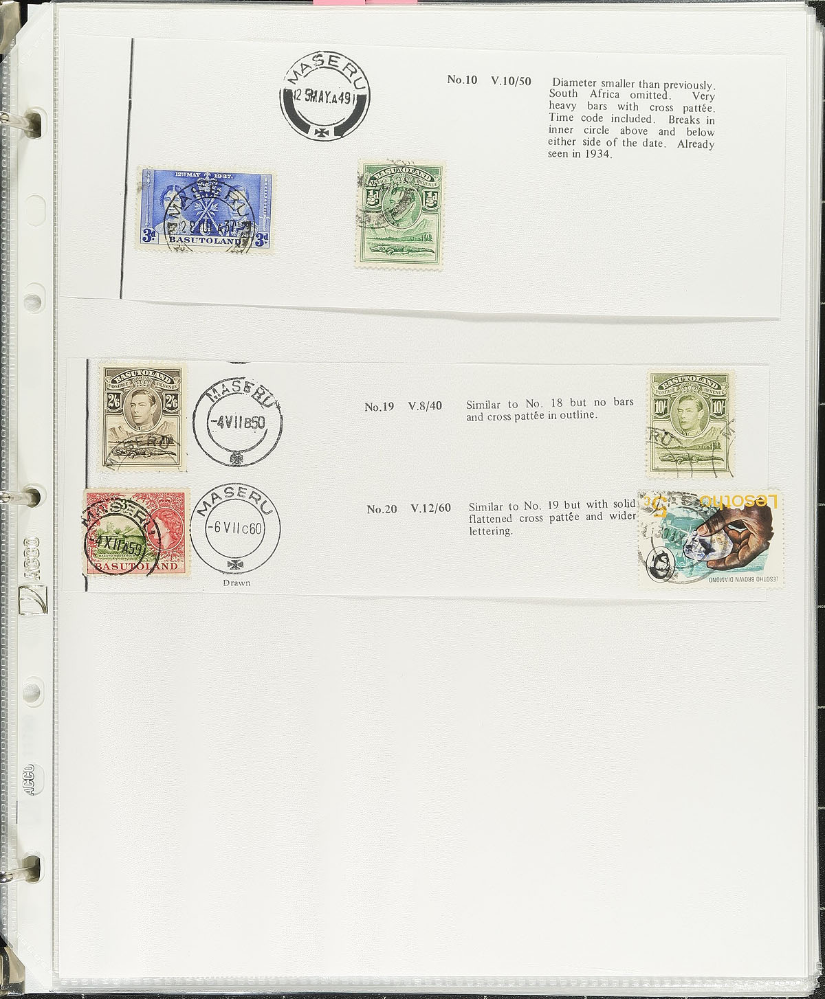 Collections of British Africa collected for town postmarks, 1900's-1990's, containing many hundreds of stamps (mostly on piece), and over 100 covers on many homemade pages housed in 4 binders. We note roughly 100 different towns represented from Swaziland (ranging from B-T), Basutoland / Lesotho (A-T), Uganda (A-U), and Kenya (N-Y, most notably from Nairobi), with each town represented with at least one stamp or cover. Just a few of the towns encountered include Nhlangand, Tshaneni, Lebihan Falls, Quthing, and much more. The collections also include several pages with cancel information and many illustrations of town cancel types, maps, and more. A nice lot for the postmark collector and should be continued and perhaps exhibited. Online photos show a sampling. Estimate =