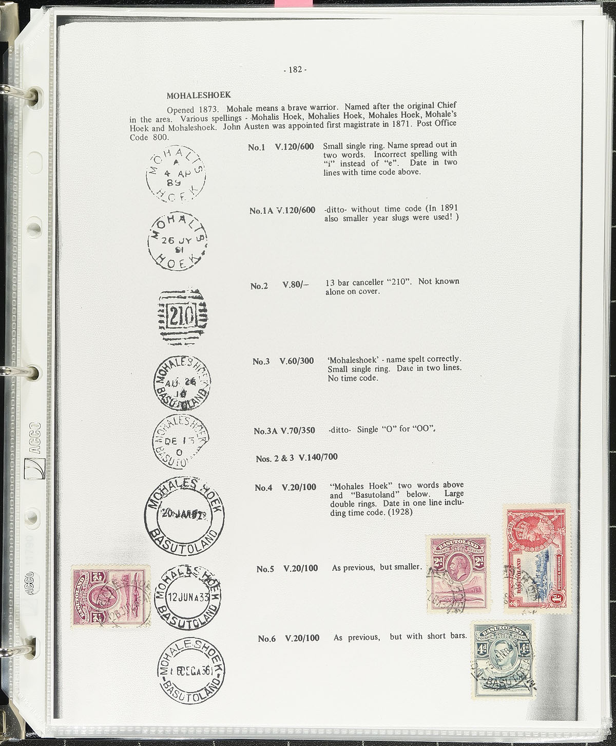Collections of British Africa collected for town postmarks, 1900's-1990's, containing many hundreds of stamps (mostly on piece), and over 100 covers on many homemade pages housed in 4 binders. We note roughly 100 different towns represented from Swaziland (ranging from B-T), Basutoland / Lesotho (A-T), Uganda (A-U), and Kenya (N-Y, most notably from Nairobi), with each town represented with at least one stamp or cover. Just a few of the towns encountered include Nhlangand, Tshaneni, Lebihan Falls, Quthing, and much more. The collections also include several pages with cancel information and many illustrations of town cancel types, maps, and more. A nice lot for the postmark collector and should be continued and perhaps exhibited. Online photos show a sampling. Estimate =