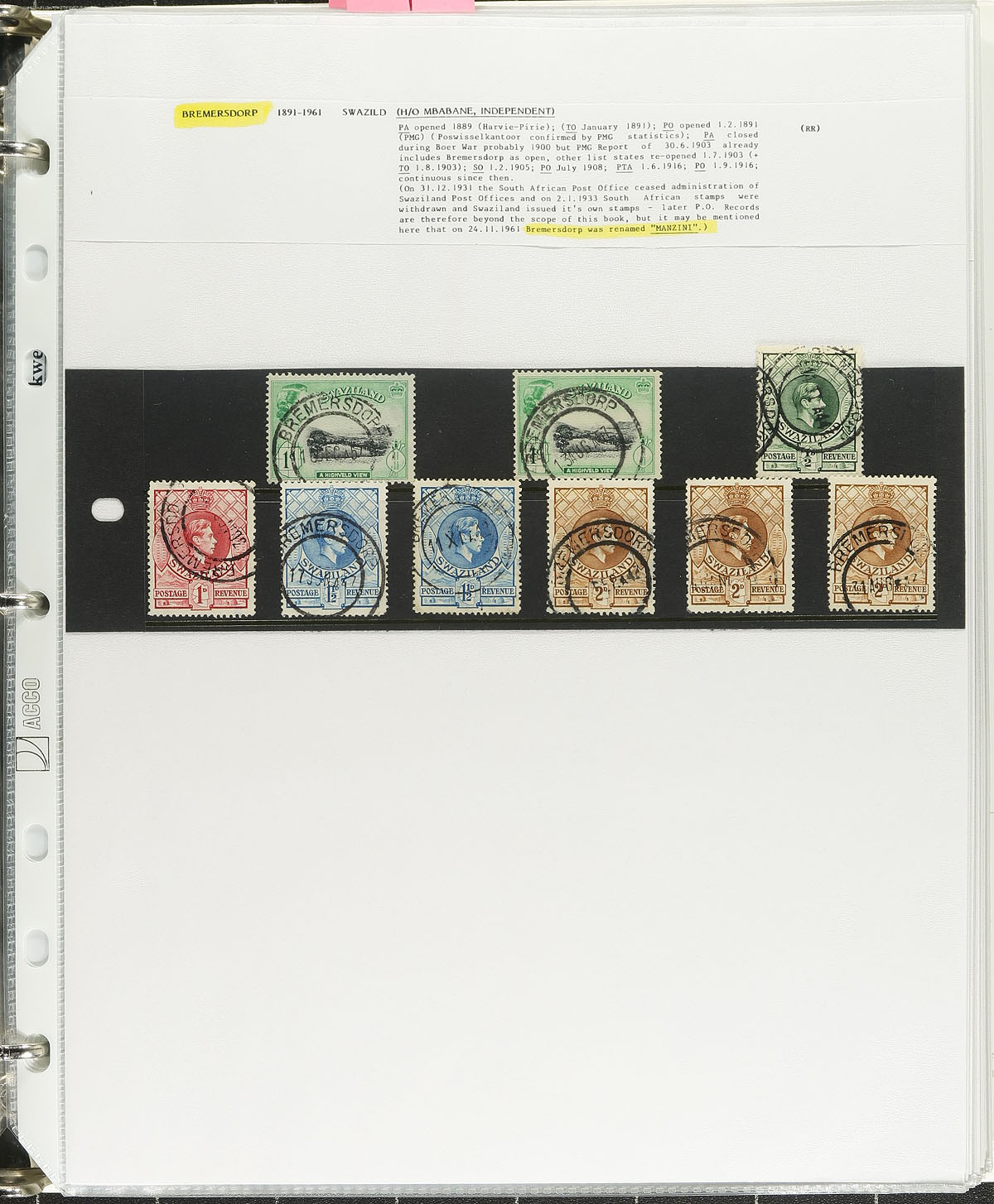 Collections of British Africa collected for town postmarks, 1900's-1990's, containing many hundreds of stamps (mostly on piece), and over 100 covers on many homemade pages housed in 4 binders. We note roughly 100 different towns represented from Swaziland (ranging from B-T), Basutoland / Lesotho (A-T), Uganda (A-U), and Kenya (N-Y, most notably from Nairobi), with each town represented with at least one stamp or cover. Just a few of the towns encountered include Nhlangand, Tshaneni, Lebihan Falls, Quthing, and much more. The collections also include several pages with cancel information and many illustrations of town cancel types, maps, and more. A nice lot for the postmark collector and should be continued and perhaps exhibited. Online photos show a sampling. Estimate =