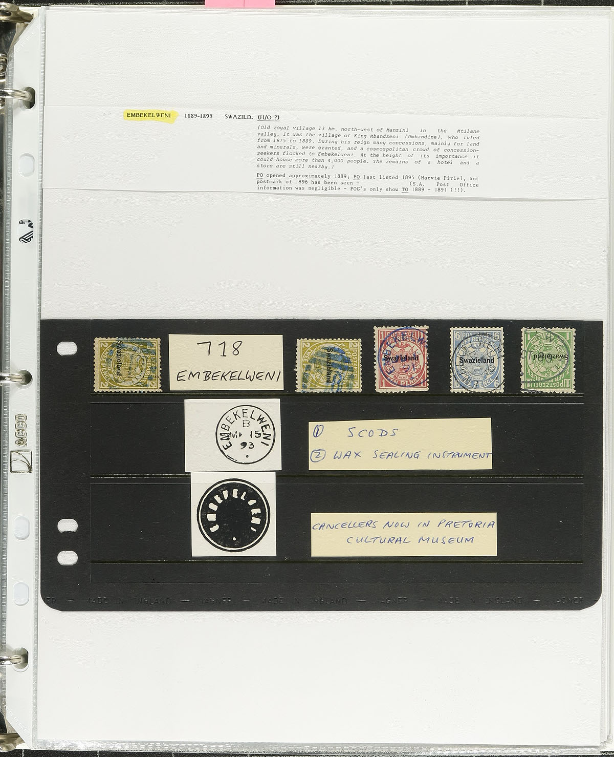 Collections of British Africa collected for town postmarks, 1900's-1990's, containing many hundreds of stamps (mostly on piece), and over 100 covers on many homemade pages housed in 4 binders. We note roughly 100 different towns represented from Swaziland (ranging from B-T), Basutoland / Lesotho (A-T), Uganda (A-U), and Kenya (N-Y, most notably from Nairobi), with each town represented with at least one stamp or cover. Just a few of the towns encountered include Nhlangand, Tshaneni, Lebihan Falls, Quthing, and much more. The collections also include several pages with cancel information and many illustrations of town cancel types, maps, and more. A nice lot for the postmark collector and should be continued and perhaps exhibited. Online photos show a sampling. Estimate =