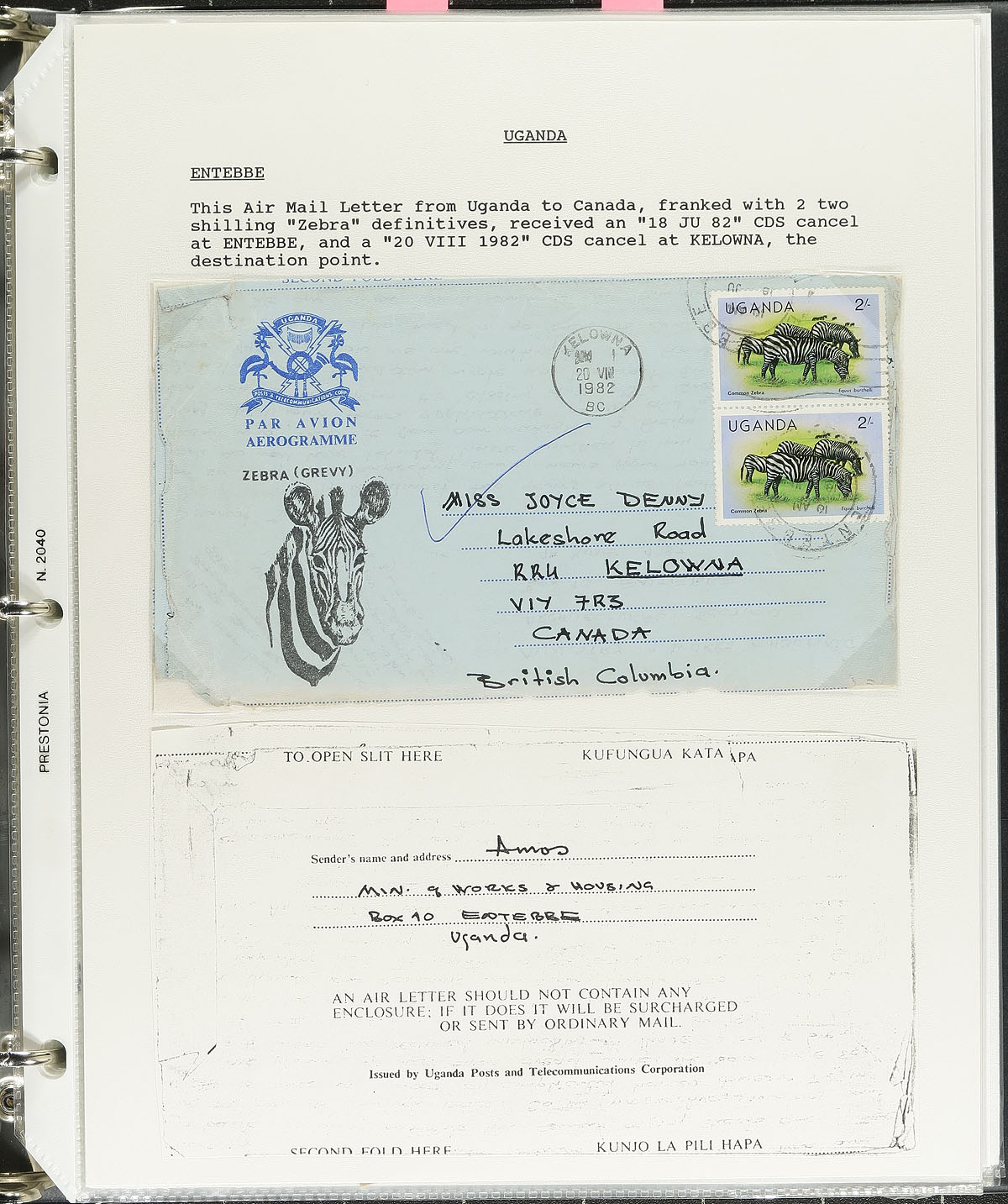 Collections of British Africa collected for town postmarks, 1900's-1990's, containing many hundreds of stamps (mostly on piece), and over 100 covers on many homemade pages housed in 4 binders. We note roughly 100 different towns represented from Swaziland (ranging from B-T), Basutoland / Lesotho (A-T), Uganda (A-U), and Kenya (N-Y, most notably from Nairobi), with each town represented with at least one stamp or cover. Just a few of the towns encountered include Nhlangand, Tshaneni, Lebihan Falls, Quthing, and much more. The collections also include several pages with cancel information and many illustrations of town cancel types, maps, and more. A nice lot for the postmark collector and should be continued and perhaps exhibited. Online photos show a sampling. Estimate =