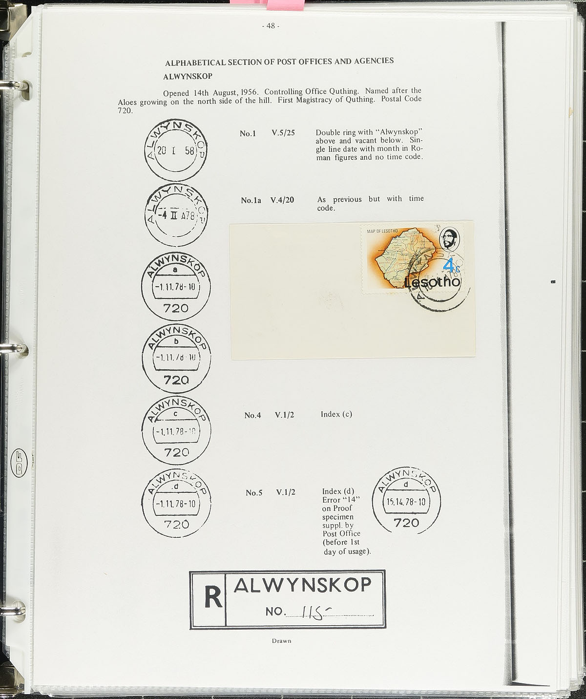 Collections of British Africa collected for town postmarks, 1900's-1990's, containing many hundreds of stamps (mostly on piece), and over 100 covers on many homemade pages housed in 4 binders. We note roughly 100 different towns represented from Swaziland (ranging from B-T), Basutoland / Lesotho (A-T), Uganda (A-U), and Kenya (N-Y, most notably from Nairobi), with each town represented with at least one stamp or cover. Just a few of the towns encountered include Nhlangand, Tshaneni, Lebihan Falls, Quthing, and much more. The collections also include several pages with cancel information and many illustrations of town cancel types, maps, and more. A nice lot for the postmark collector and should be continued and perhaps exhibited. Online photos show a sampling. Estimate =
