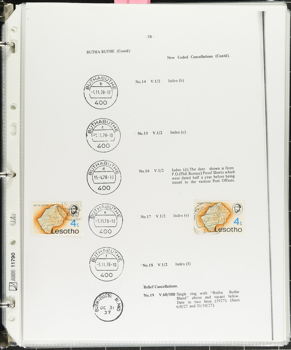 Collections of British Africa collected for town postmarks, 1900's-1990's, containing many hundreds of stamps (mostly on piece), and over 100 covers on many homemade pages housed in 4 binders. We note roughly 100 different towns represented from Swaziland (ranging from B-T), Basutoland / Lesotho (A-T), Uganda (A-U), and Kenya (N-Y, most notably from Nairobi), with each town represented with at least one stamp or cover. Just a few of the towns encountered include Nhlangand, Tshaneni, Lebihan Falls, Quthing, and much more. The collections also include several pages with cancel information and many illustrations of town cancel types, maps, and more. A nice lot for the postmark collector and should be continued and perhaps exhibited. Online photos show a sampling. Estimate =