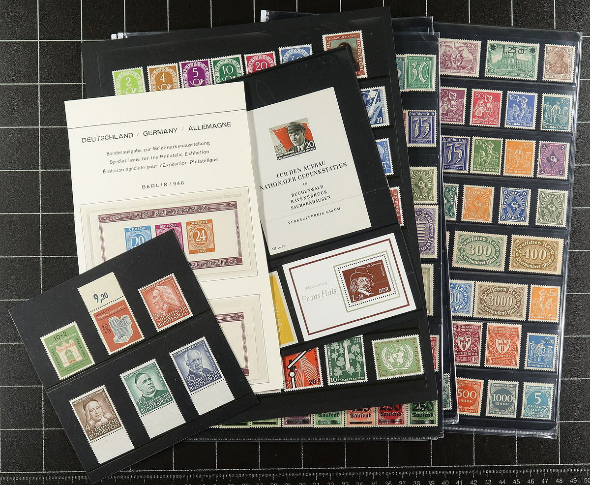 Group of mint Germany, 1918-1955, containing a few hundred stamps on a handful of stock pages. We note representation from Germany, generally ranging from Scott #96/736. along with a small selection of DDR, and semi-postal issues. The strength of the lost is the post WWII issues, including Scott #s Germany B332-B337 (nh, $112 total), DDR B21a souvenir sheet (nh, $100). Owner's 2017 Scott catalogue value for the lot totals US$617.00 ($832.95 CDN), with duplication up to 1 for a few earlier issues. A nice lot for the mint collector, overall very fine. Estimate =
