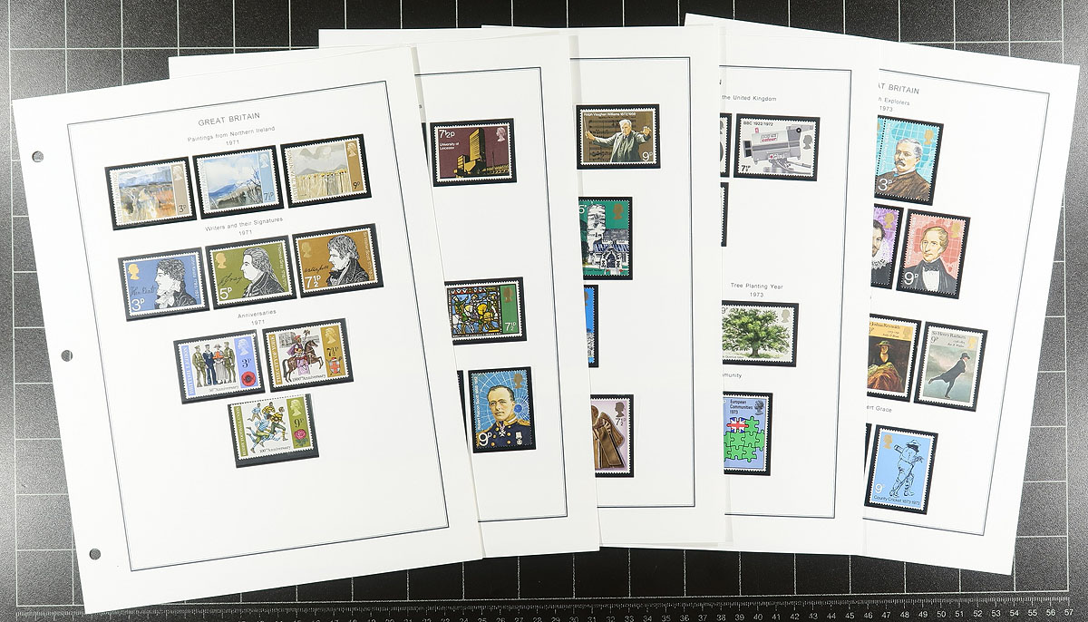 Collection of never hinged Great Britain, 1971-1990's, containing roughly 700 stamps in several album pages, presentation packs, and in glassines. The bulk of the lot is the collection in hingeless computer generated album pages, ranging from Scott #648/1566. The lot also contains 15 presentation packs from the 1980's-1990's, and singles and blocks in glassines. Face value of the lot is roughly £185.00. A nice clean lot for all collectors, or for postage users. Estimate =