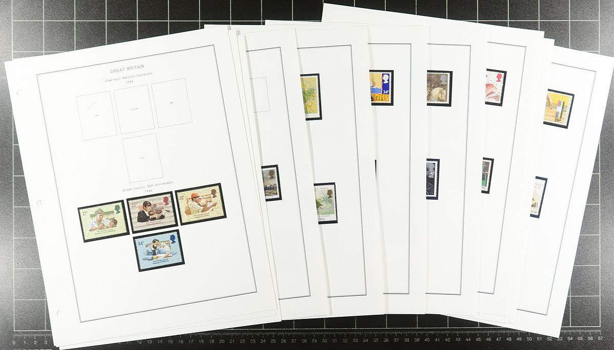 Collection of never hinged Great Britain, 1971-1990's, containing roughly 700 stamps in several album pages, presentation packs, and in glassines. The bulk of the lot is the collection in hingeless computer generated album pages, ranging from Scott #648/1566. The lot also contains 15 presentation packs from the 1980's-1990's, and singles and blocks in glassines. Face value of the lot is roughly £185.00. A nice clean lot for all collectors, or for postage users. Estimate =