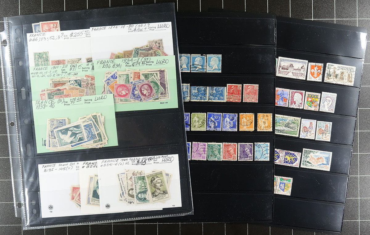 Nice eclectic collection of mint and used France, 1854-2002, containing many hundreds of stamps in a handful of stock pages. The collection generally ranges from Scott #15/1397, along with selection of semi-postals, airmails, a 2002 annual collection, and more. A spot check indicated primarily used isses from the classic period up to the 1940s, with mild duplication throughout, with some mint material afterwards. Some items catalogue $10 and up, including a few Monaco Europa sheetlets ranging from 1974/1985, with owner's 2018 Scott catalogue value for the lot totalling US$1,378.00 ($1860.30 CDN), leaving better finds to the dedicated collector. A few faults to be expected with a few of the early issues, still a nice lot from this popular collecting country. Estimate =