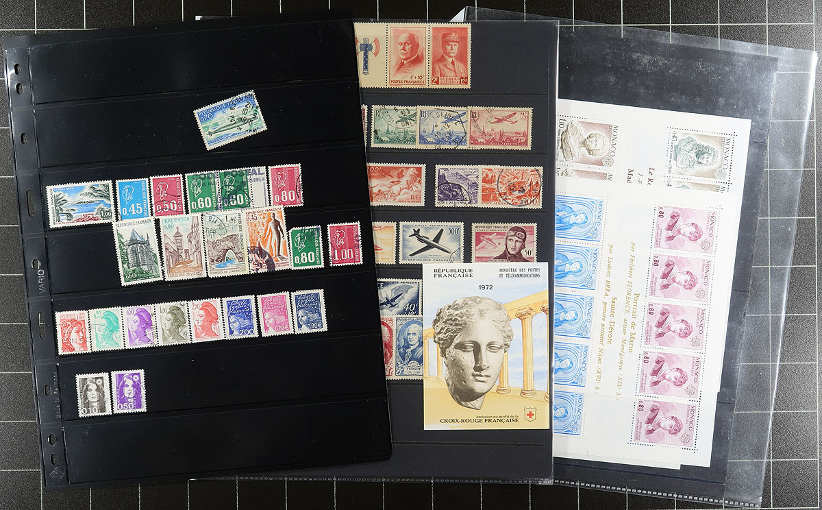Nice eclectic collection of mint and used France, 1854-2002, containing many hundreds of stamps in a handful of stock pages. The collection generally ranges from Scott #15/1397, along with selection of semi-postals, airmails, a 2002 annual collection, and more. A spot check indicated primarily used isses from the classic period up to the 1940s, with mild duplication throughout, with some mint material afterwards. Some items catalogue $10 and up, including a few Monaco Europa sheetlets ranging from 1974/1985, with owner's 2018 Scott catalogue value for the lot totalling US$1,378.00 ($1860.30 CDN), leaving better finds to the dedicated collector. A few faults to be expected with a few of the early issues, still a nice lot from this popular collecting country. Estimate =