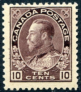 Fresh and Fine mint Never Hinged example of the 1912 issue 10c plum KGV Admiral. One of the key early Admirals, this one with pristine NH gum. 2025 Scott US$700.00 =