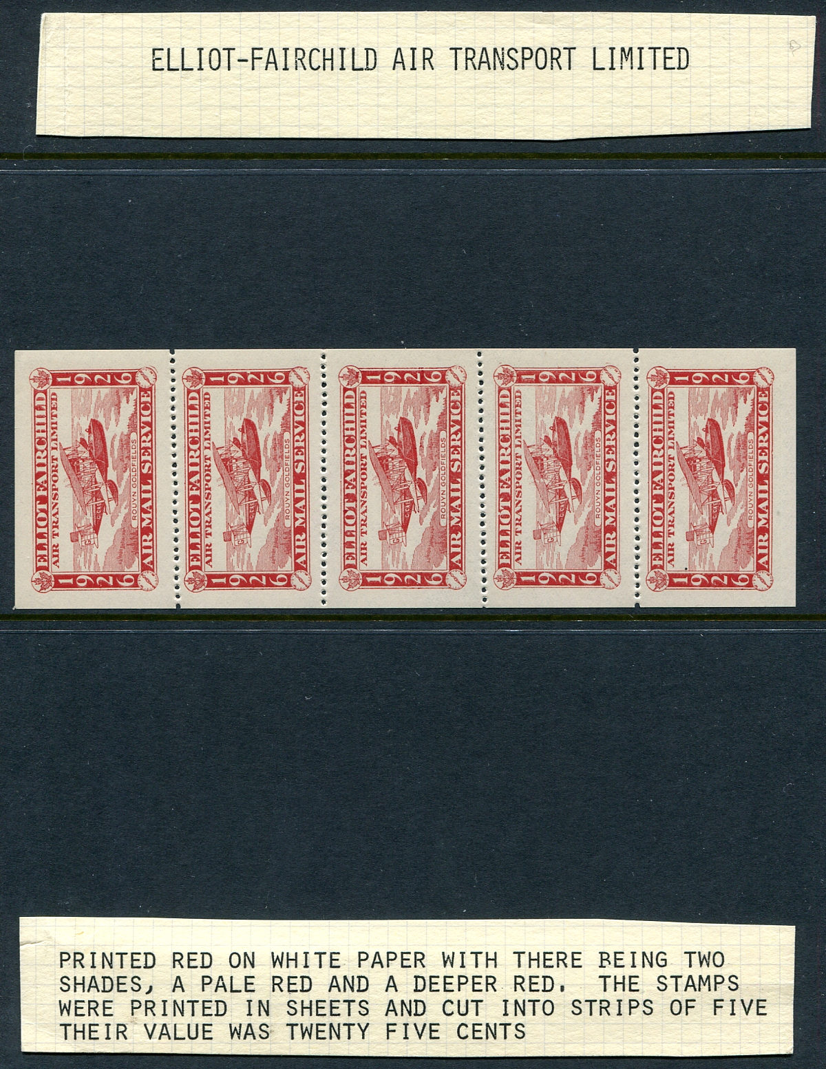 VF mint Never Hinged complete vertical pane of five of the 1926 Elliot-Fairchild Air Transport Ltd, semi-official airmail stamps. Included the "white dot over O in ELLIOT" Unitrade listed variety (#CL10b) on the 4th stamp down. 2025-2026 Untrade =