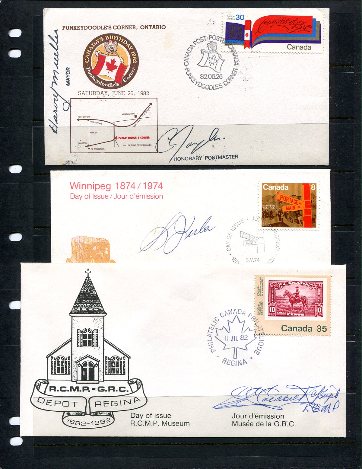 First Day Covers. A "something different" offering of 7 FDC 1969-1982 with each item being selected for an interesting attribute. Staring off with SIGNED FDC, including 1974 Winnipeg (signed by Mayor Stephen Juba), 1982 RCMP (signed by RCMP Superintendent), 1982 Constitution (signed by Punkeydoodles Corner ONT Mayor), 1989 WWII Anniversary (signed by 4x different dignitaries) and 1985 Canadian Navy (two signatures, to be identified). These are followed by an interested duo of Canada Post "Replacement" cachets (1969 Suzor-Cote / Issac Brock) which were used for Post Office diplomatic purposes, mailed to the editor of a Swiss philatelic publication. An interesting group. Estimate =