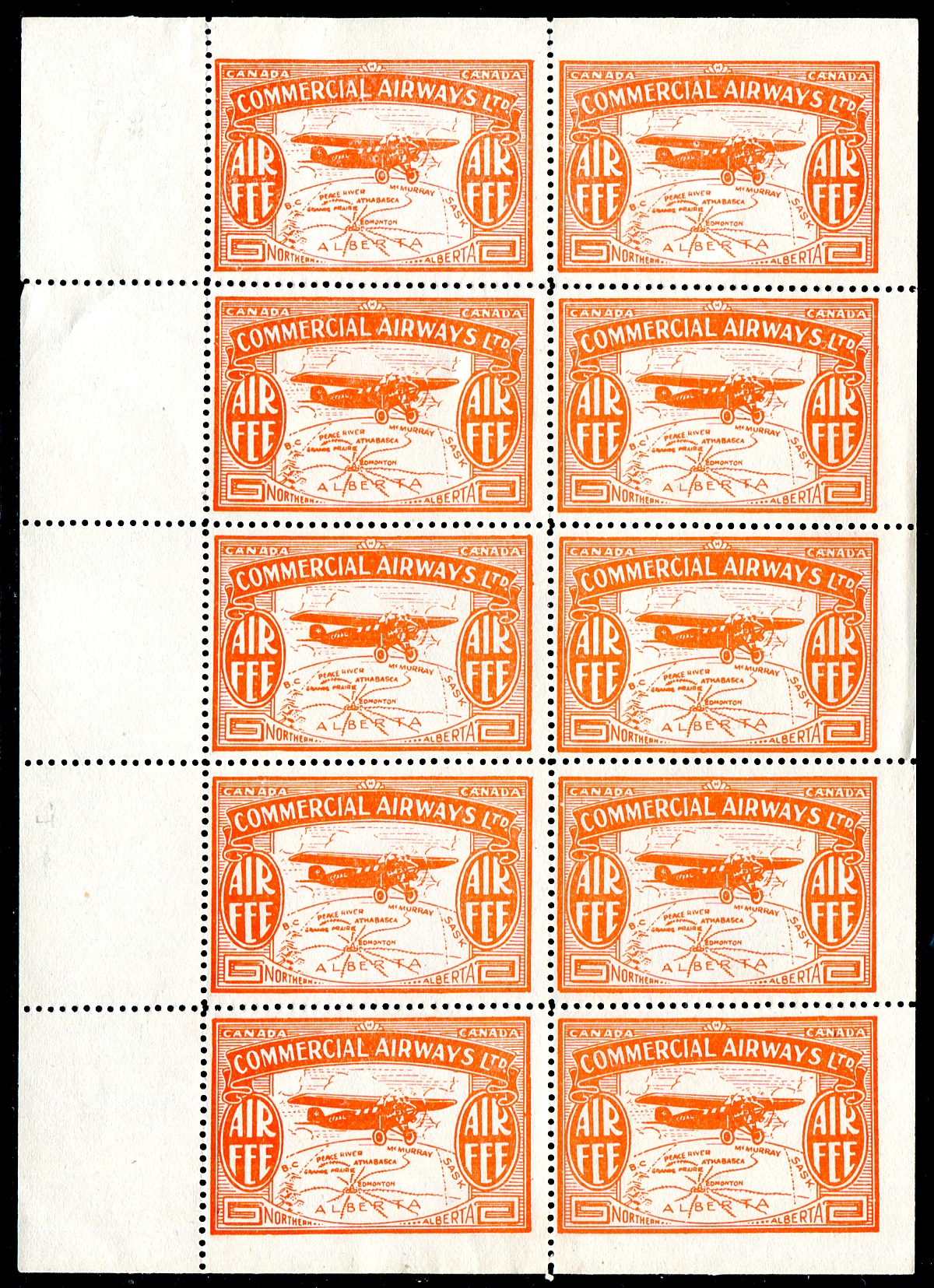 Compete mint pane of 10 of the 1930 issued 10c orange Commercial Airways semi-official airmail stamp. Includes the "break in oval" Unitrade listed variety, in position 1. Some minor gum bends /perf separation UL corner, and hinged on the lower pair, so valued as singles rather than a pane. 2025-2026 Unitrade =