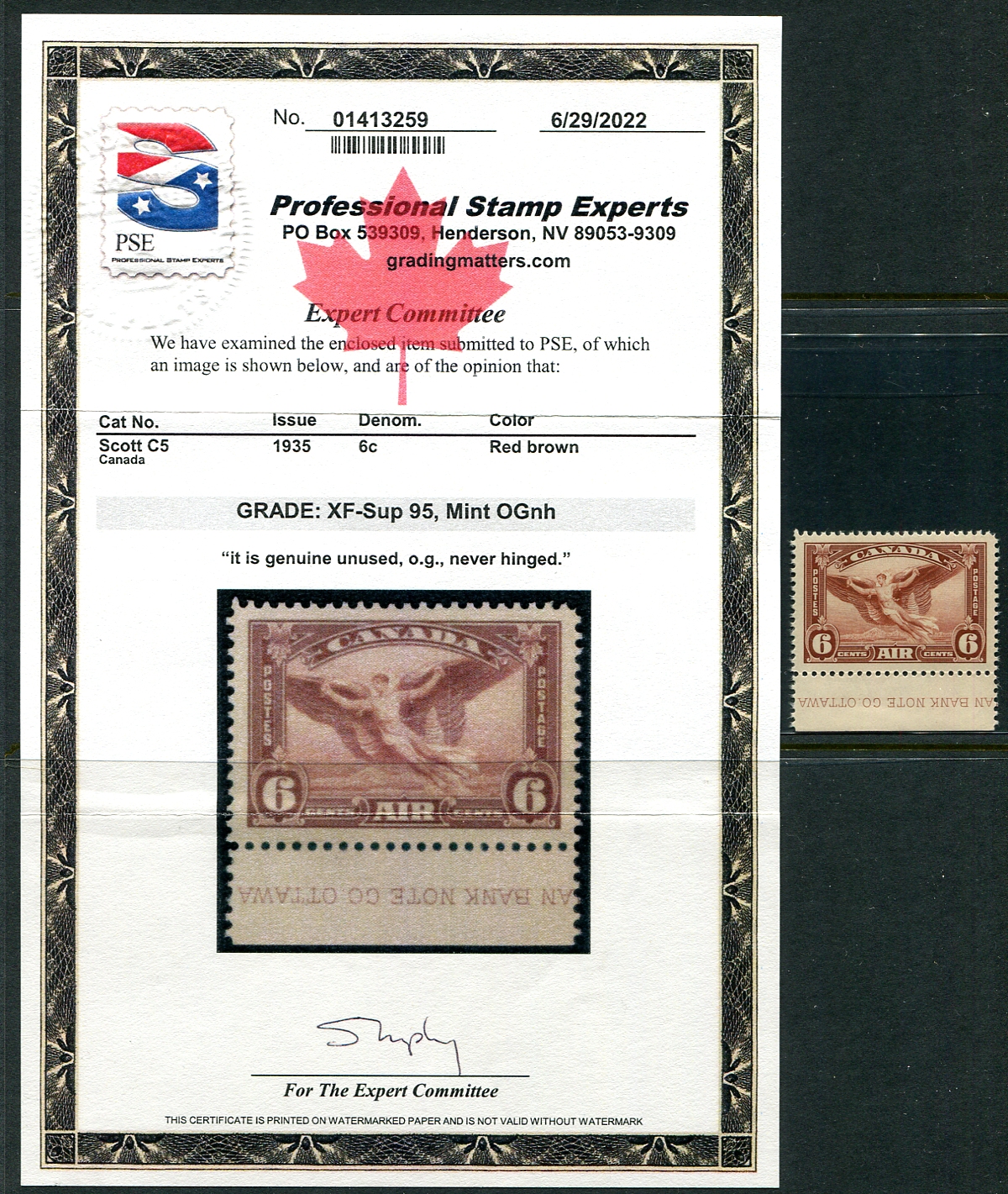 VF mint Never Hinged example of the 1935 issued 6c red brown "Daedalus" airmail stamp, accompanied by 2022 PSE certification grading it at "XF-SUP 95". While graded stamps have not caught too much traction yet with Canadian collectors, graded stamps have found a ready market in the United States, with well graded stamps selling for multiples of the full catalogue value. Estimate =
