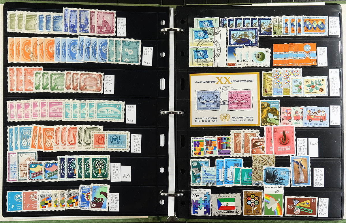 A holding of UN, including mint and used stamps on Vario stockpages, commemorative covers, an "Abria"hingless album and an empty 1967 Harris album to "expand". Issues start in the 1950's and are hit and miss a bit running into the 1980's. The owner has tabulated that there are 893 stamps, with a catalogue value of US$550.10 ($742.65 CDN). Estimate =