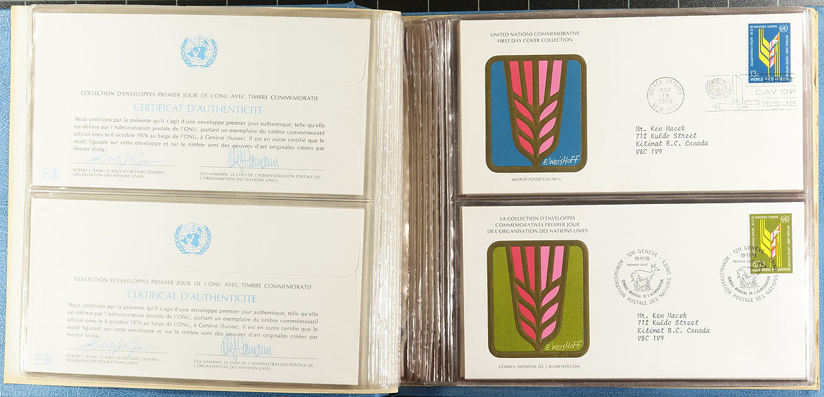 A holding of UN, including mint and used stamps on Vario stockpages, commemorative covers, an "Abria"hingless album and an empty 1967 Harris album to "expand". Issues start in the 1950's and are hit and miss a bit running into the 1980's. The owner has tabulated that there are 893 stamps, with a catalogue value of US$550.10 ($742.65 CDN). Estimate =