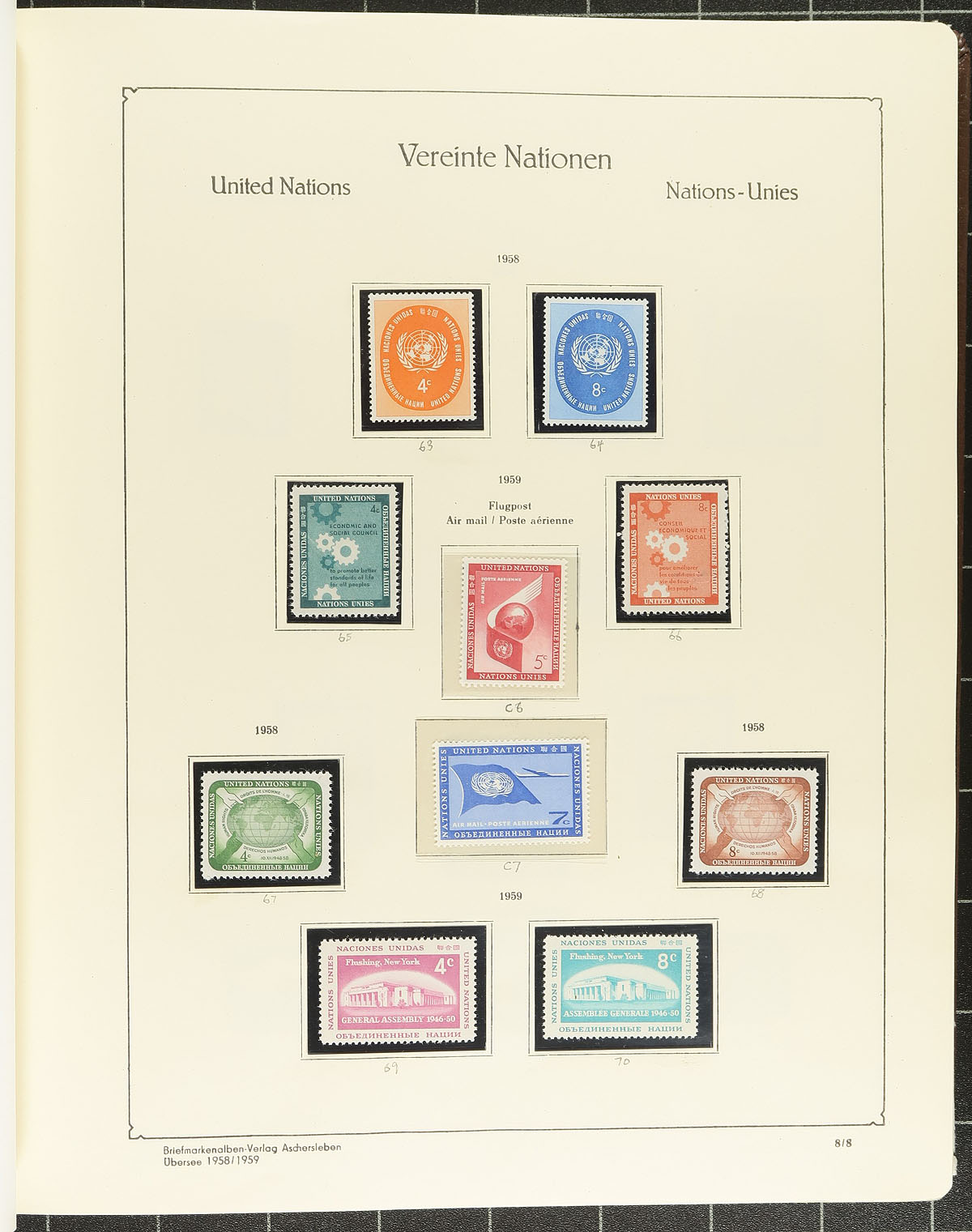 A holding of UN, including mint and used stamps on Vario stockpages, commemorative covers, an "Abria"hingless album and an empty 1967 Harris album to "expand". Issues start in the 1950's and are hit and miss a bit running into the 1980's. The owner has tabulated that there are 893 stamps, with a catalogue value of US$550.10 ($742.65 CDN). Estimate =