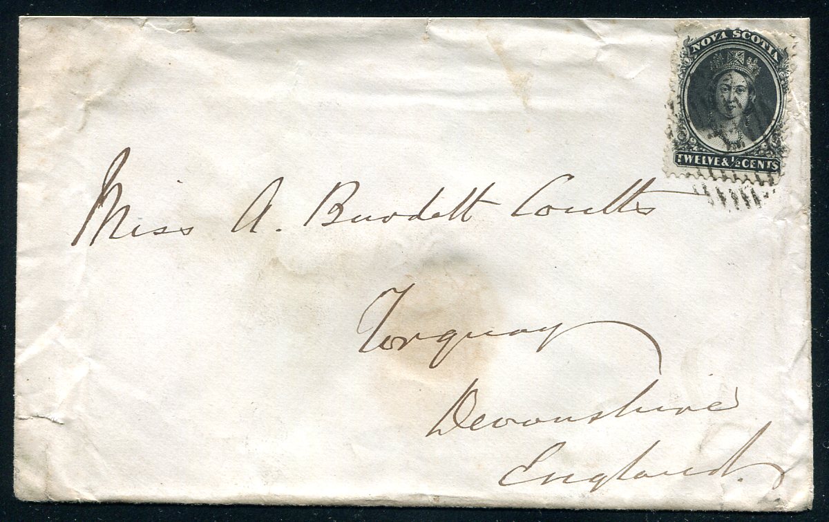 Attractive single use on-cover example of the 1860 issue 12½c black Victoria, sent from Halifax (backstamped) on October 29th 1863 to "Miss A. Burdett Coutts, Torquay, Devon, England". A great single use, properly used in-period paying the Allan Steamship line rate to the UK. Historically important, addressed to Angela Georgina Burdett-Coutts, referred to as "the richest heiress in England" at the time. A bit of time online will unlock her fascinating history, including being president of the "British Beekeeping Assc" from 1878-1906. The second (and last) item we have from this correspondence. 2025-2026 Unitrade =