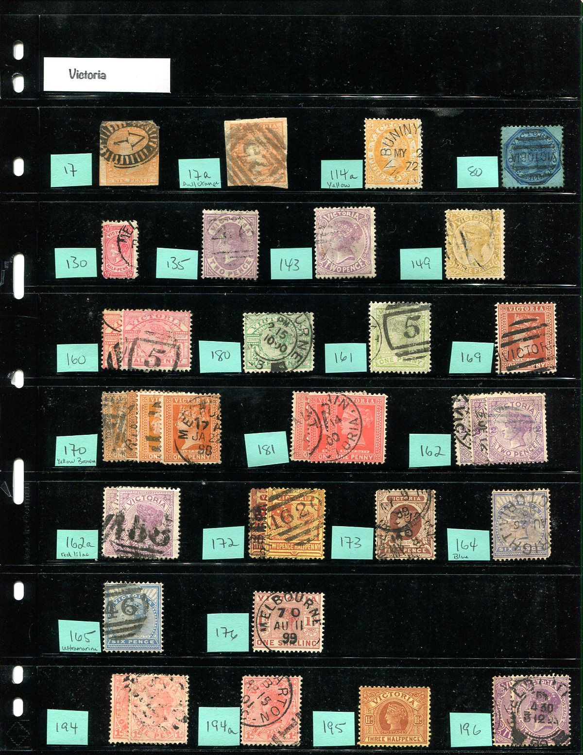 A quality used selection from all six Australian States, being an excellent "foot in the door" starter group, or study assembly for someone looking to search for varieties. A total of 172 stamps, neatly arranged and identified on Vario stockpages. While the owner has not cataloged the stamps clearly faulty, expect the of small fault (short perfs, etc). Owner's 2021 Scott US$1,070.00 =