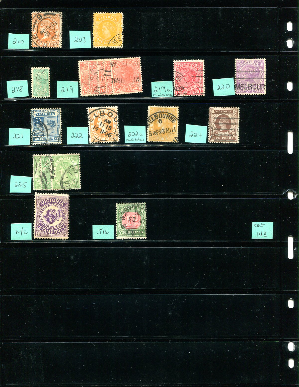A quality used selection from all six Australian States, being an excellent "foot in the door" starter group, or study assembly for someone looking to search for varieties. A total of 172 stamps, neatly arranged and identified on Vario stockpages. While the owner has not cataloged the stamps clearly faulty, expect the of small fault (short perfs, etc). Owner's 2021 Scott US$1,070.00 =
