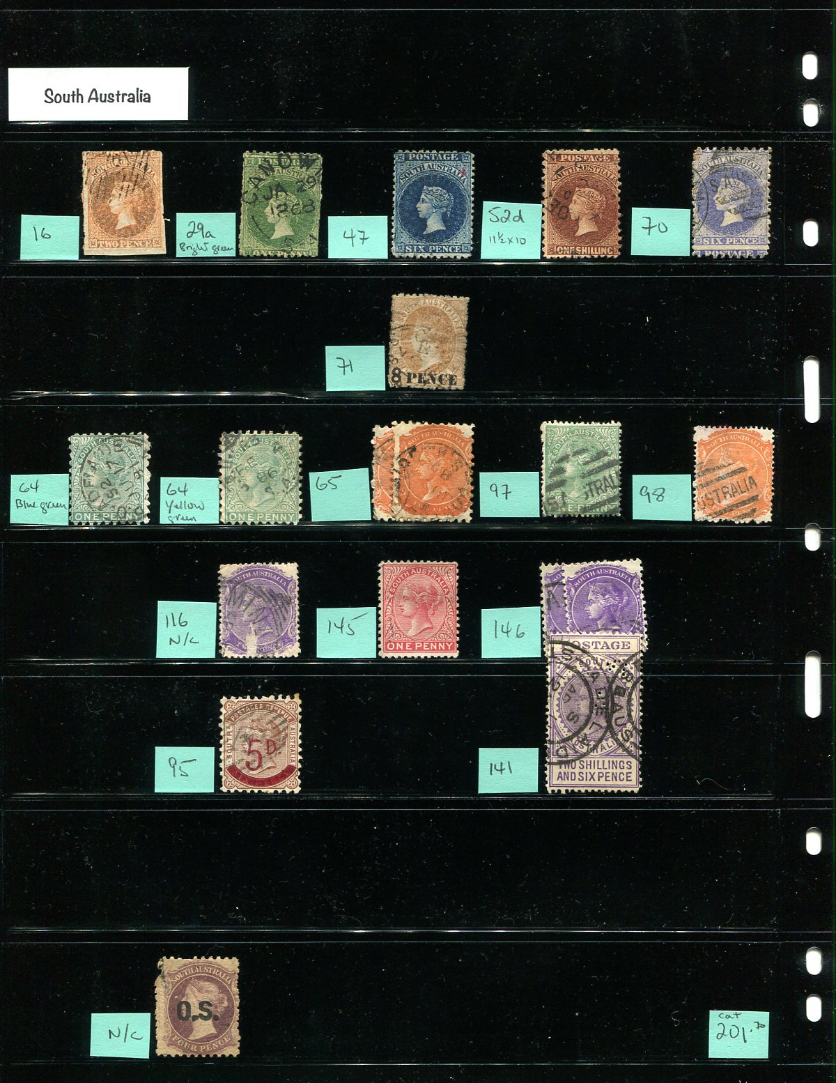 A quality used selection from all six Australian States, being an excellent "foot in the door" starter group, or study assembly for someone looking to search for varieties. A total of 172 stamps, neatly arranged and identified on Vario stockpages. While the owner has not cataloged the stamps clearly faulty, expect the of small fault (short perfs, etc). Owner's 2021 Scott US$1,070.00 =