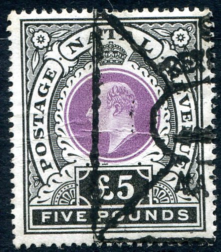 Attractive appearing example of the £5.00 black and violet, 1902-1903 issued Edward VII high-value, with revenue / fiscal cancellation. A nice chance to fill this spot in the album, at a fraction of a postally used example (Scott US$1400.00 for postal cancel). Even as a non-postal cancel, clean fiscal postmark examples sell for a high percentage of catalogue, as a reasonable way to fill this spot in the album. As Postal Fiscal cancel 2025 Scott US$110.00 =