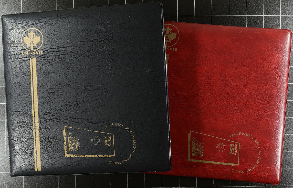 A bankers box, filled with 10x Unisafe brand FDC albums, all lightly used with padded covers and black pages. Each of these albums will hold 100 covers (up to and including the size of a modern Canadian FDC). Retail cost of these is usually in the $20-30 each range! A nice chance to find a home for 1000 items here! Estimate =