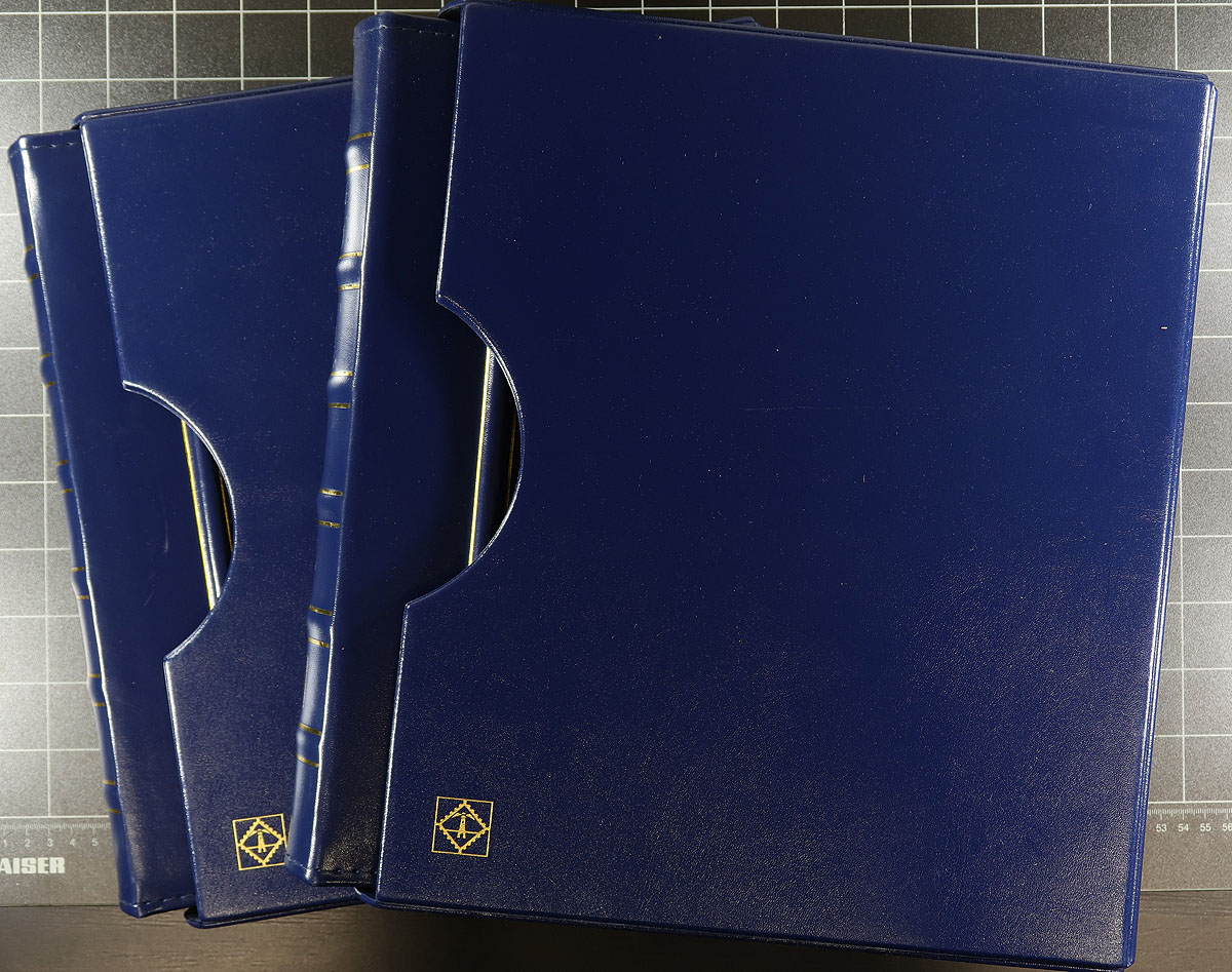 A diverse offering of supplies, filling a bankers box, including (in no particular order), 1) Two deluxe Lighthouse brand 3-ring albums with matching slipcases (both in blue). 2) Four mint sheet files (three are Unisafe "double mint sheet file, 48 sheet capacity). 3) Five Unisafe / Lighthouse brand stockbooks (16 and 32 page format). 4) Vario stockpages x 25, various sizes, most look new. Lots of value here, a nice opportunity to pick up a very useful group of supplies without having to pay retail. Estimate =
