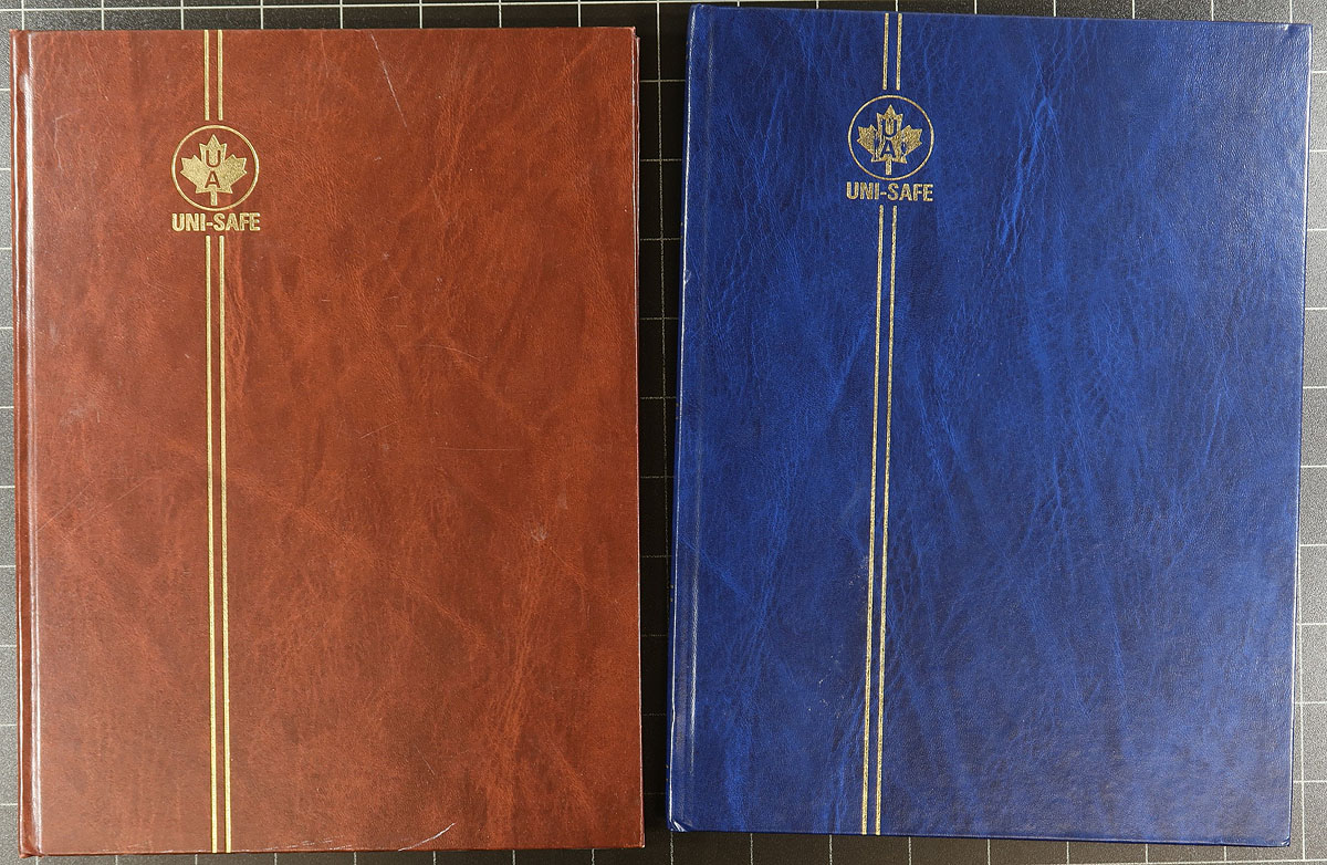 A diverse offering of supplies, filling a bankers box, including (in no particular order), 1) Two deluxe Lighthouse brand 3-ring albums with matching slipcases (both in blue). 2) Four mint sheet files (three are Unisafe "double mint sheet file, 48 sheet capacity). 3) Five Unisafe / Lighthouse brand stockbooks (16 and 32 page format). 4) Vario stockpages x 25, various sizes, most look new. Lots of value here, a nice opportunity to pick up a very useful group of supplies without having to pay retail. Estimate =