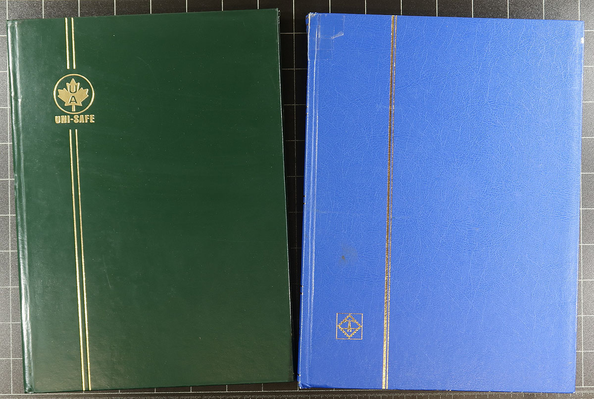 A diverse offering of supplies, filling a bankers box, including (in no particular order), 1) Two deluxe Lighthouse brand 3-ring albums with matching slipcases (both in blue). 2) Four mint sheet files (three are Unisafe "double mint sheet file, 48 sheet capacity). 3) Five Unisafe / Lighthouse brand stockbooks (16 and 32 page format). 4) Vario stockpages x 25, various sizes, most look new. Lots of value here, a nice opportunity to pick up a very useful group of supplies without having to pay retail. Estimate =