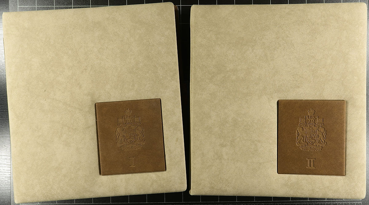 "Calling All Canada" albums lot, filling a bankers box. Includes a 3-volume set of Canada Wholesale Supply brand padded hingeless albums (Vol I, II, III) with pages from 1851-1992 (the pages have aged / yellowed, still usable, or just keep for the 3-ring binders). There are followed by a 4th empty 3-ring binder of the same make, then two Minkus green 3-ring binders (empty) and lastly an old-time Minkus Canada Album, with pages for Canadian Provinces. Estimate =