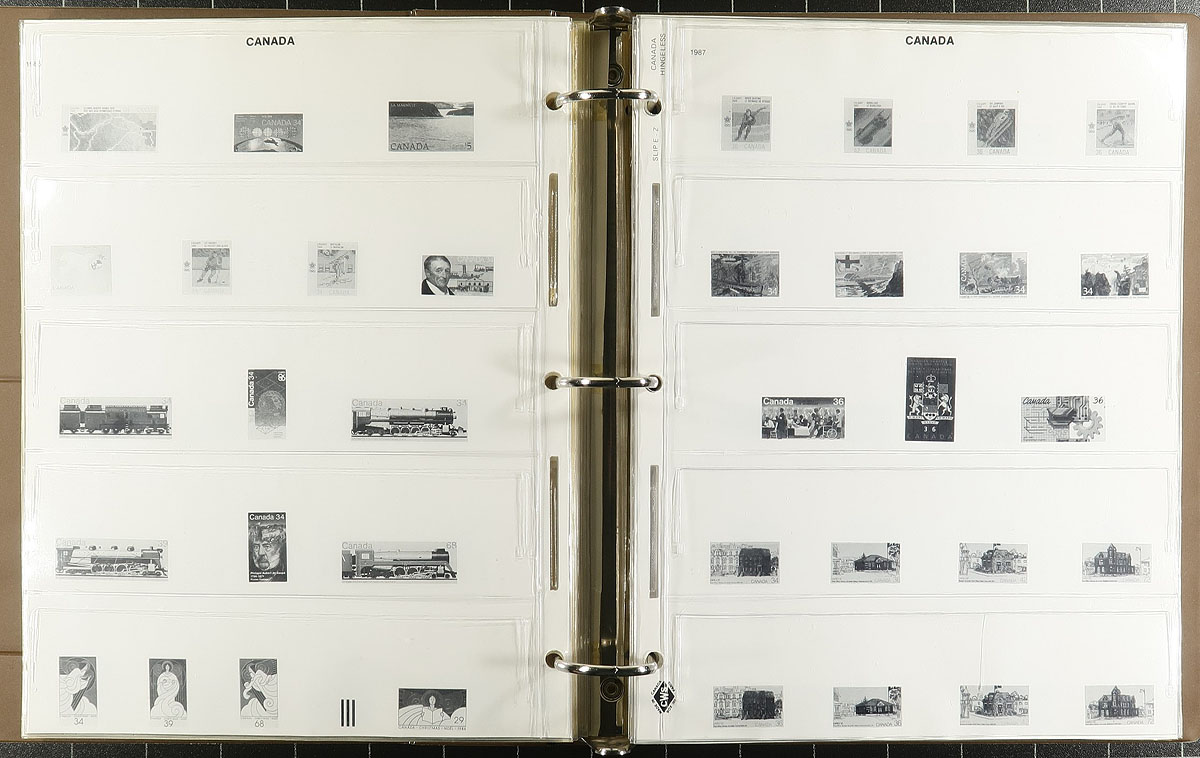 "Calling All Canada" albums lot, filling a bankers box. Includes a 3-volume set of Canada Wholesale Supply brand padded hingeless albums (Vol I, II, III) with pages from 1851-1992 (the pages have aged / yellowed, still usable, or just keep for the 3-ring binders). There are followed by a 4th empty 3-ring binder of the same make, then two Minkus green 3-ring binders (empty) and lastly an old-time Minkus Canada Album, with pages for Canadian Provinces. Estimate =